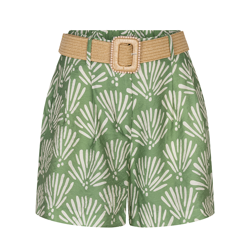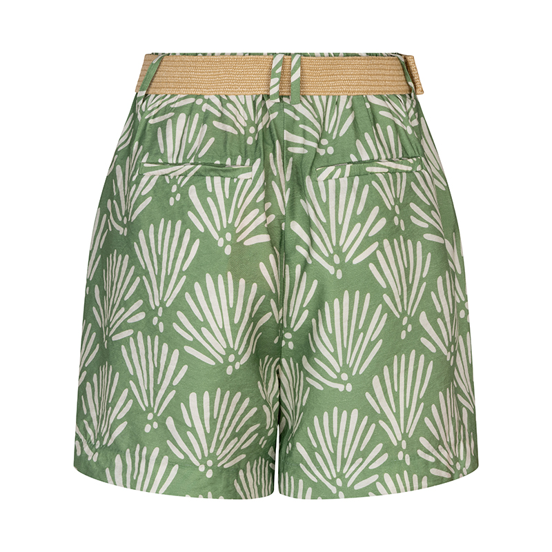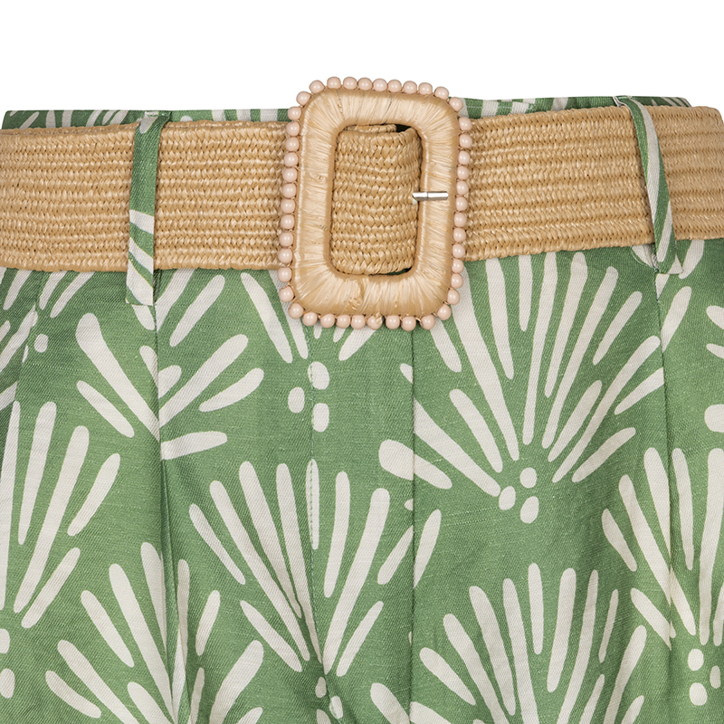 Modèle ample, plis français, poches en biais, beau vert imprimé beige. Ceinture incluse.