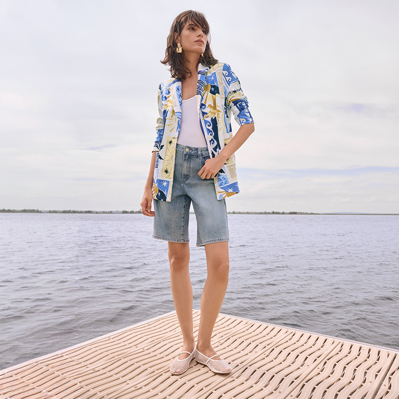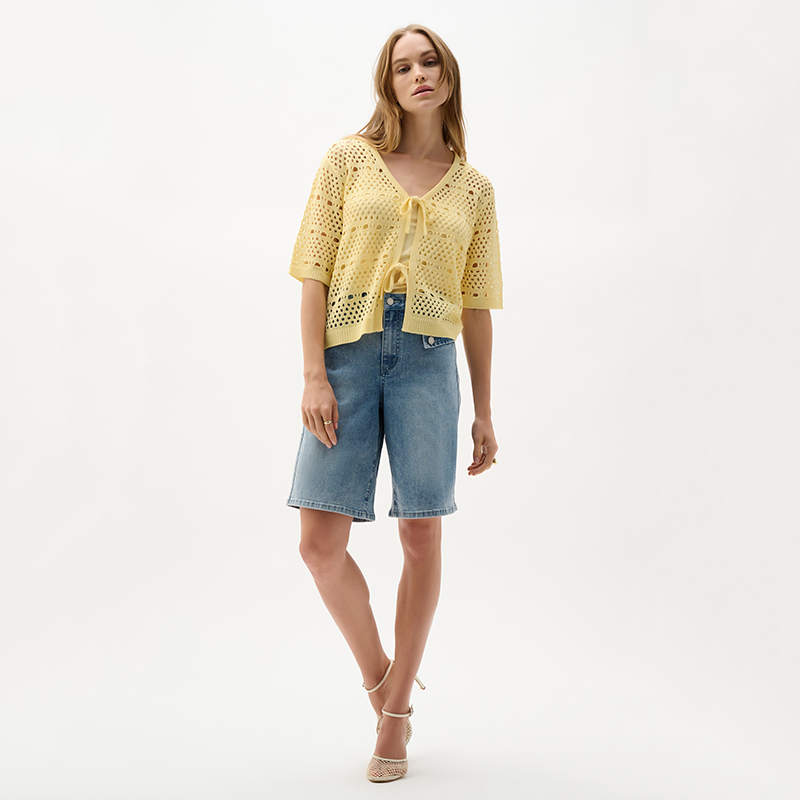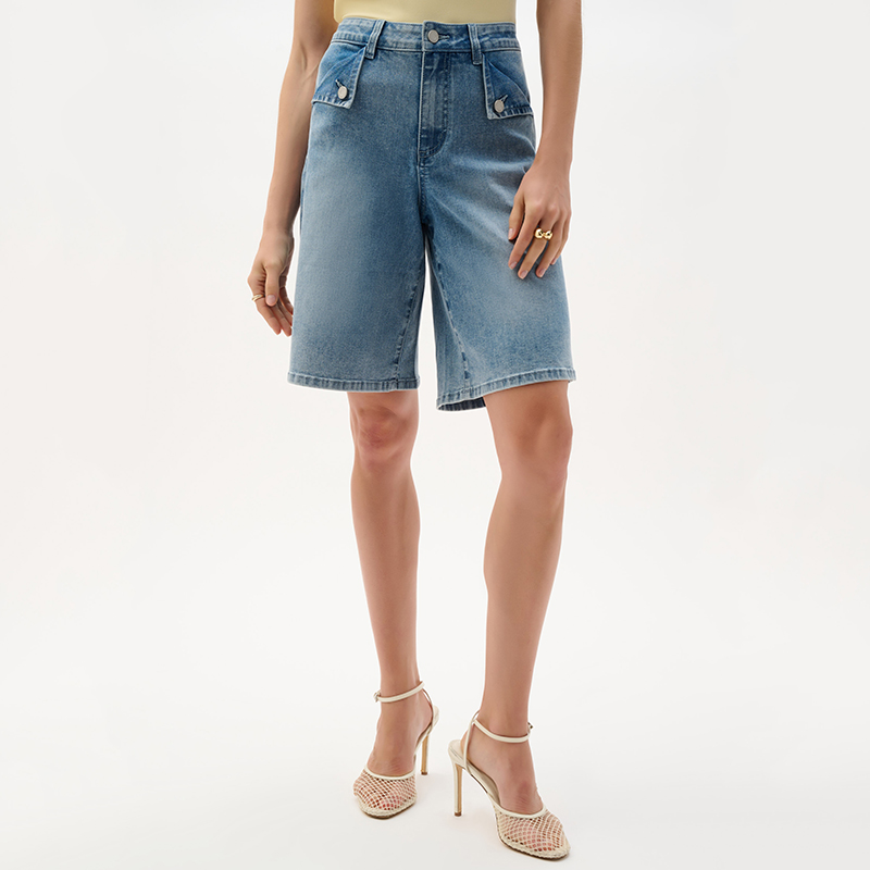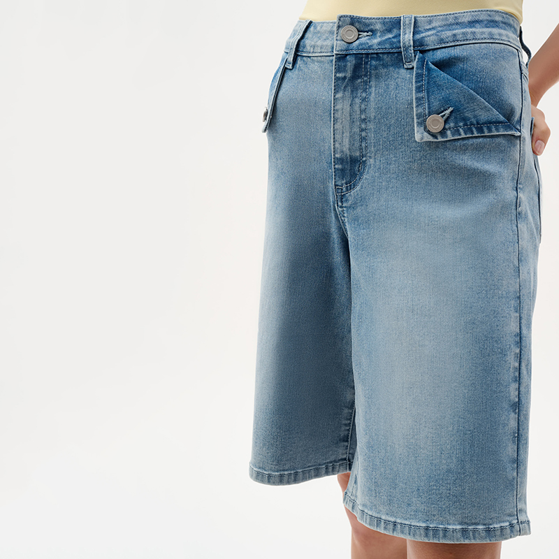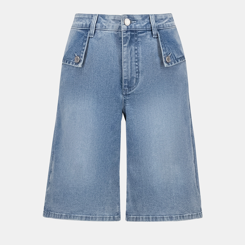 Bermuda en denim extensible et souple, taille régulière avec bouton et fermeture éclair.
