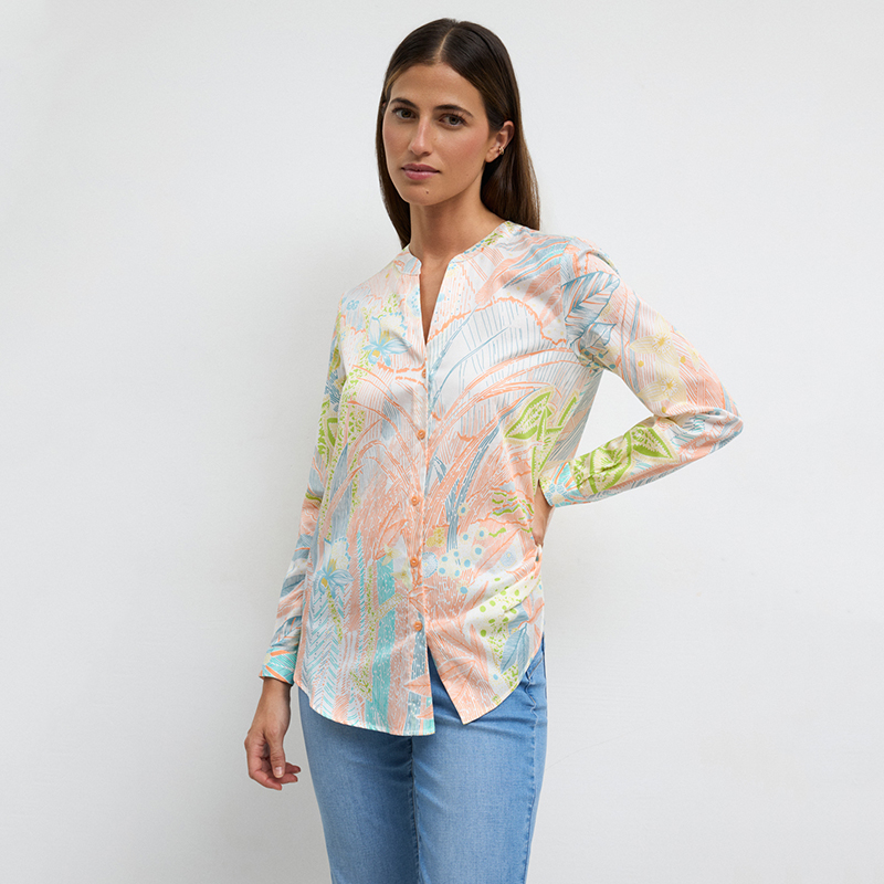 Modèle droit sans pinces, plis creux au dos, ouvert de chaque côté, bel imprimé pêche, vert lime et bleu sur fond blanc.