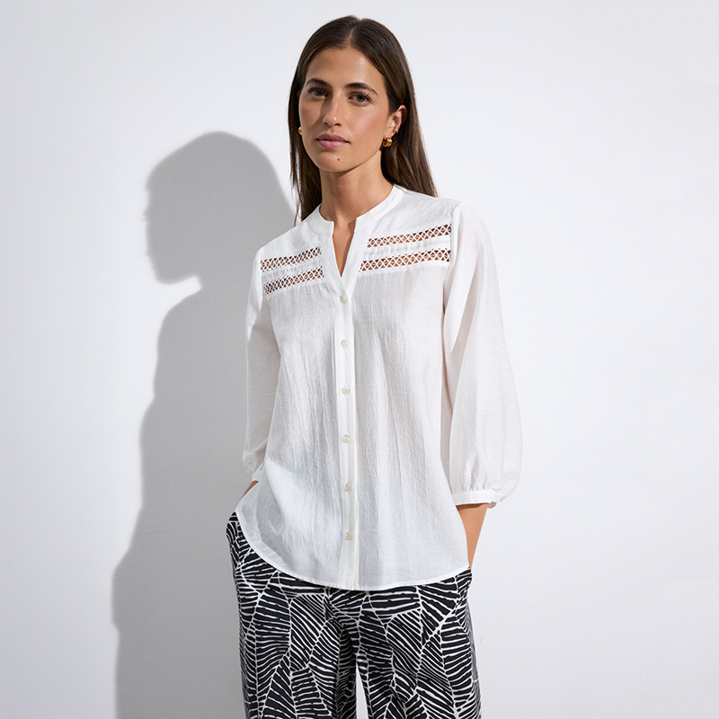 Blouse à manches 3/4 légèrement bouffantes, encolure ronde finie en pointe.