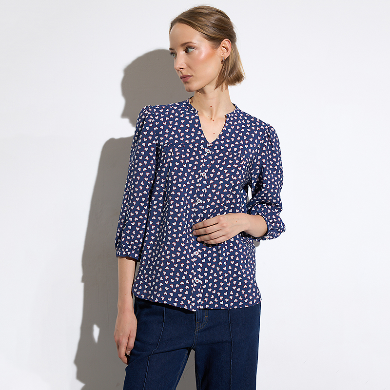 Jolie blouse à manches 3/4 plissée sur les épaules, sans col ouvert en pointe.