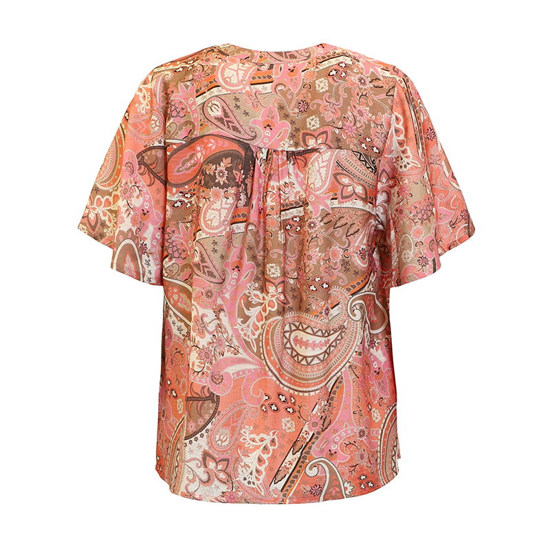 Blouse à manches courtes amples, encolure ronde finie en pointe avec un frill autour de la boutonnière.