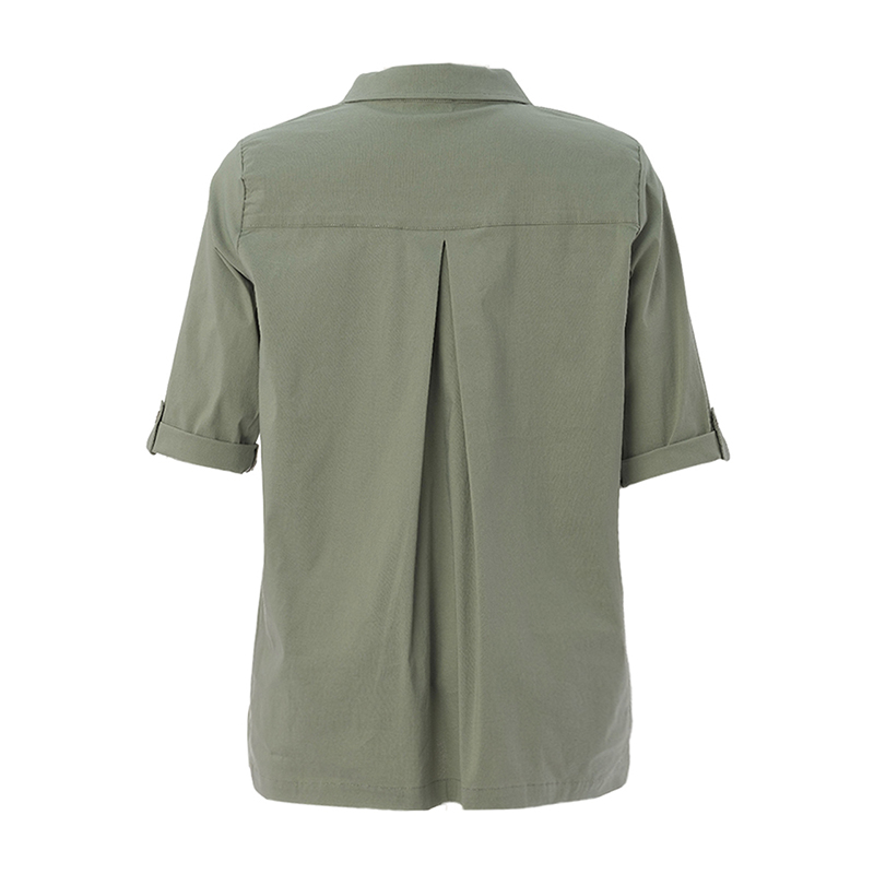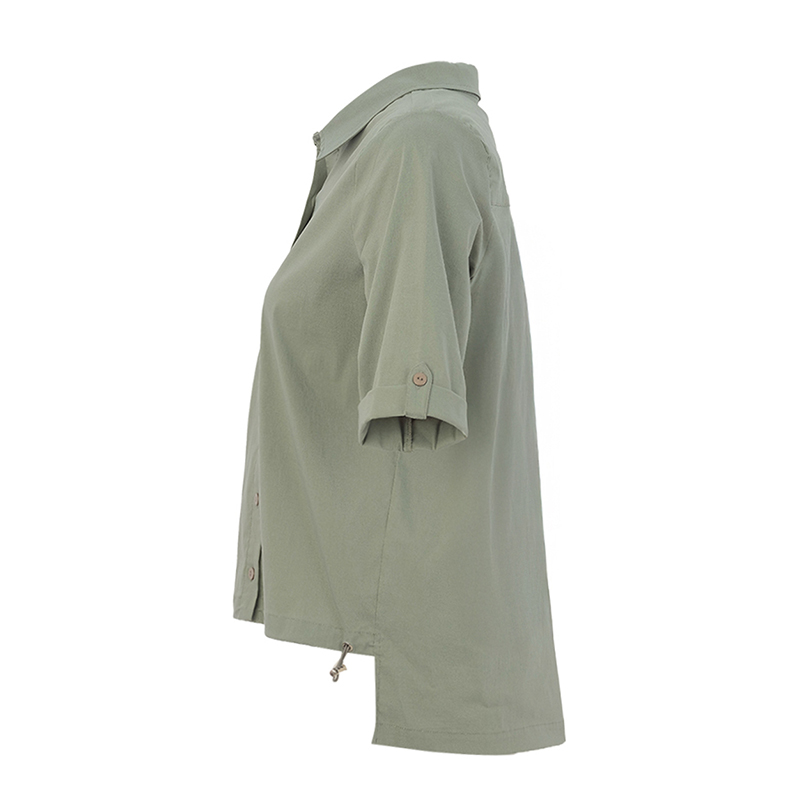 Blouse en coton extensible à manches 3/4 avec patte boutonnière pour porter en manche courte, col chemisier classique.