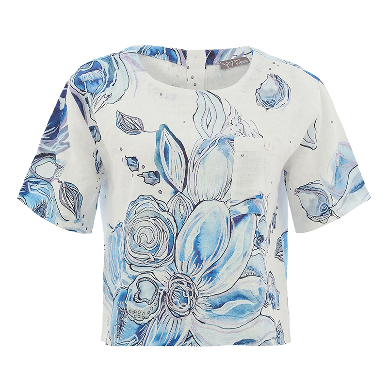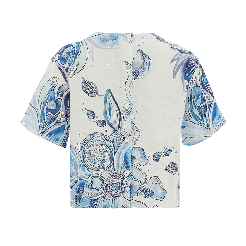 Modèle court et ample, boutonné au dos, bel imprimé bleu sur fond blanc.