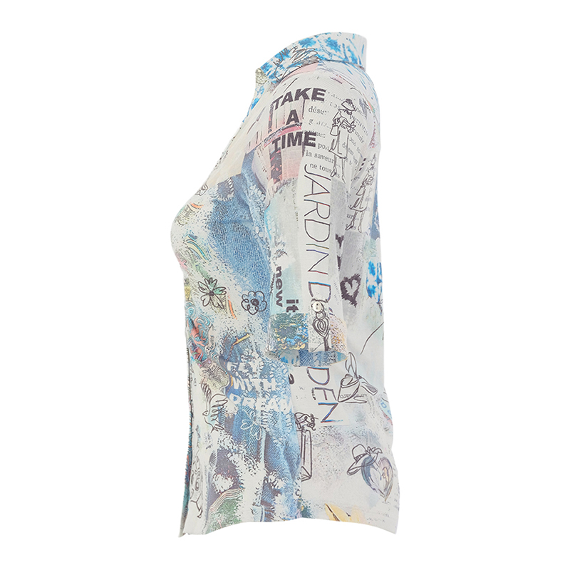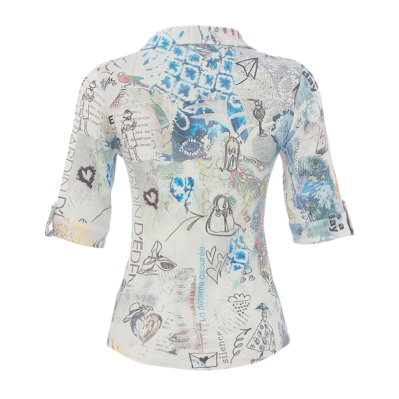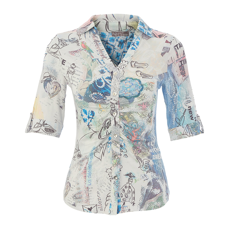 Blouse en jersey léger à manches courtes au coudes, col polo ouvert en pointe.