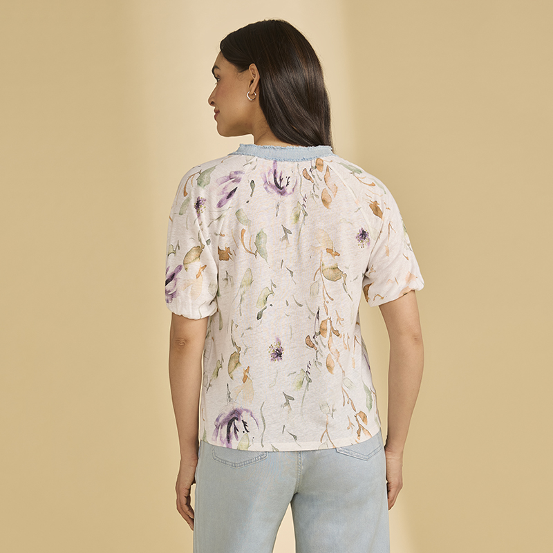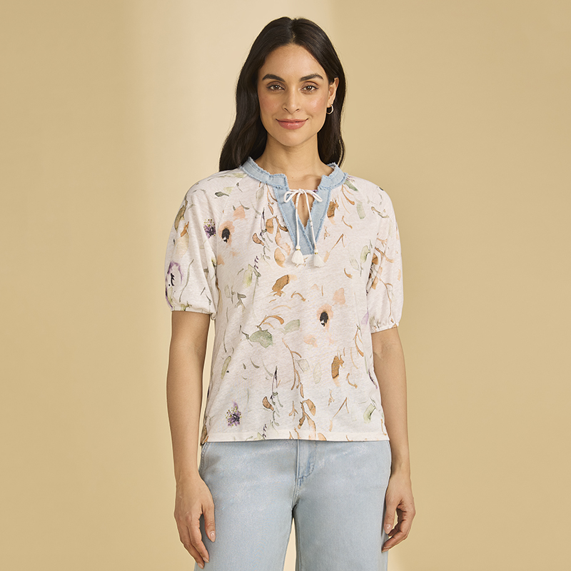 Modèle court et droit, encolure an pointe bordée de denim pâle, imprimé sur fond ivoire.
