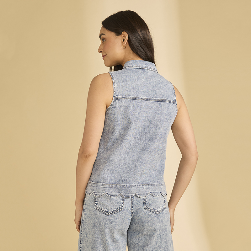 Blouse en denim sans manches, col classique au cou.