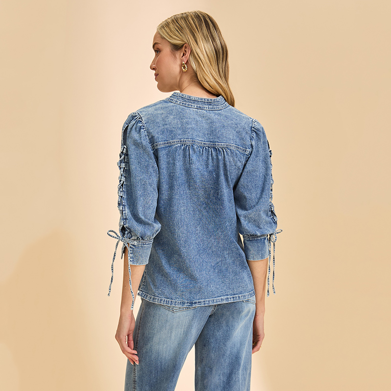 Blouse en denim à manches 3/4, lacets sur le dessus, plis sur les épaules, col Mao ouvert en pointe.