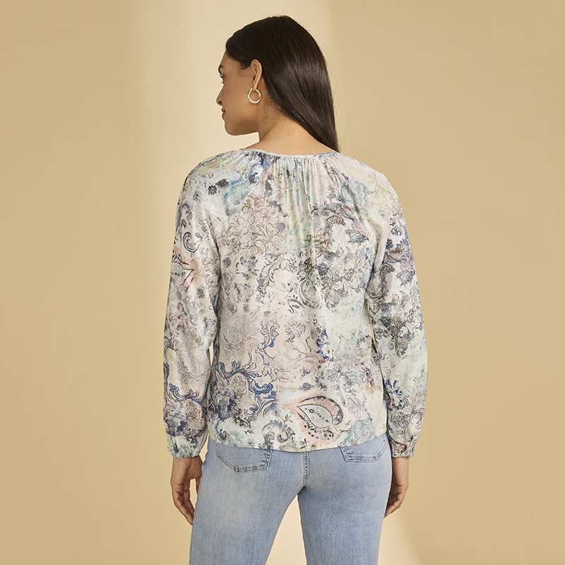Blouse à manches longues et raglan, poignets élastique, encolure ronde sans collet fini en pointe.