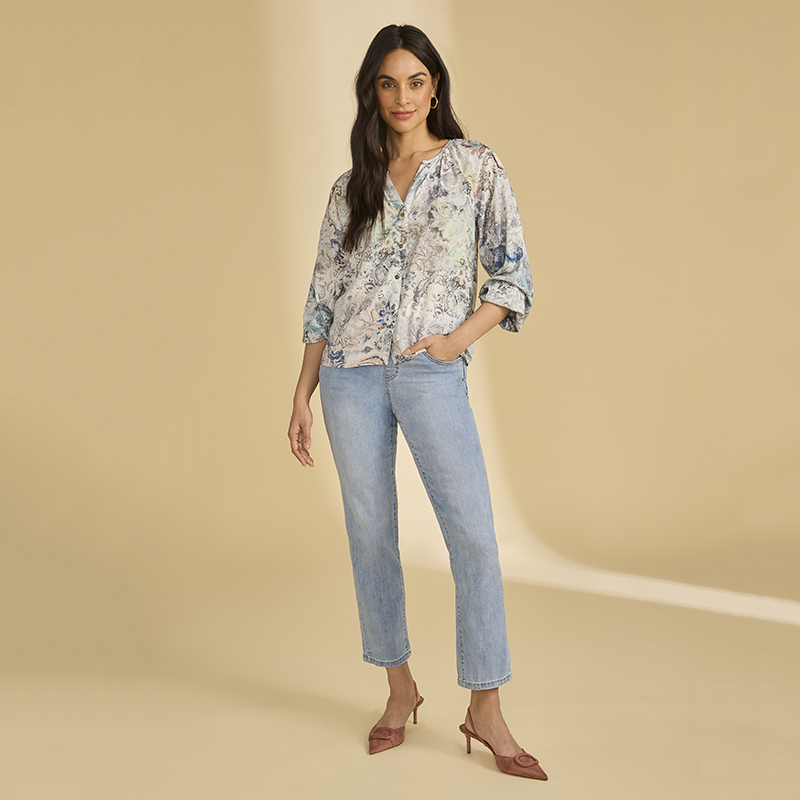 Modèle court et ample, imprimé bleu, tres beau avec les denims et les tons de beiges!