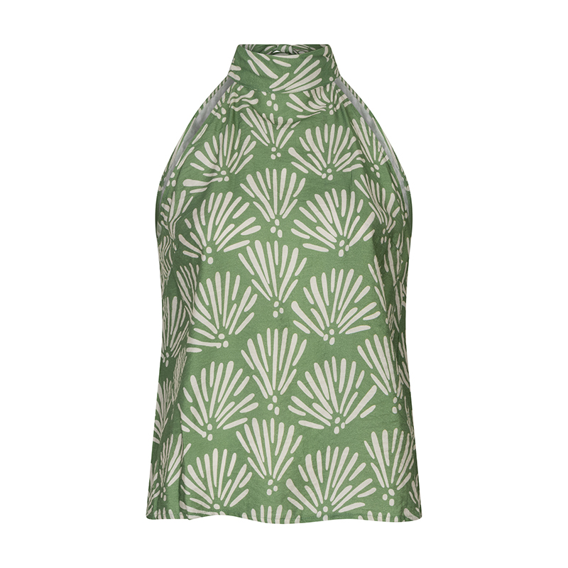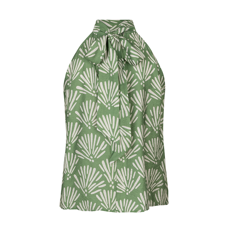 Camisole à col montant nouée au dos, emmanchure qui dégage l’épaule.