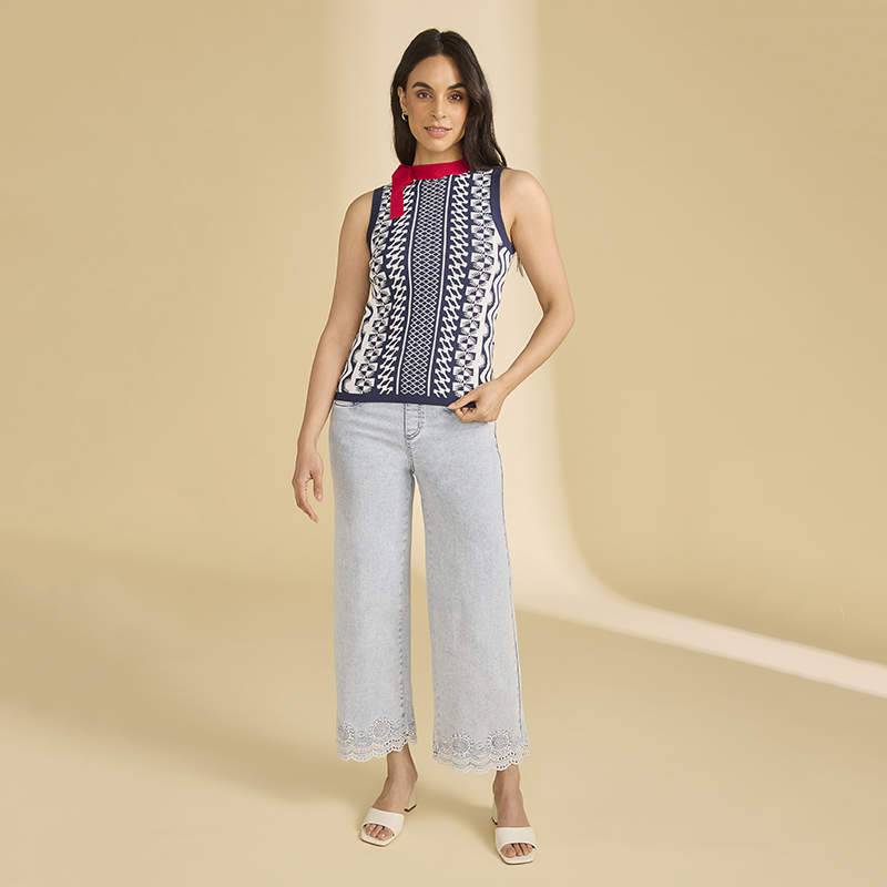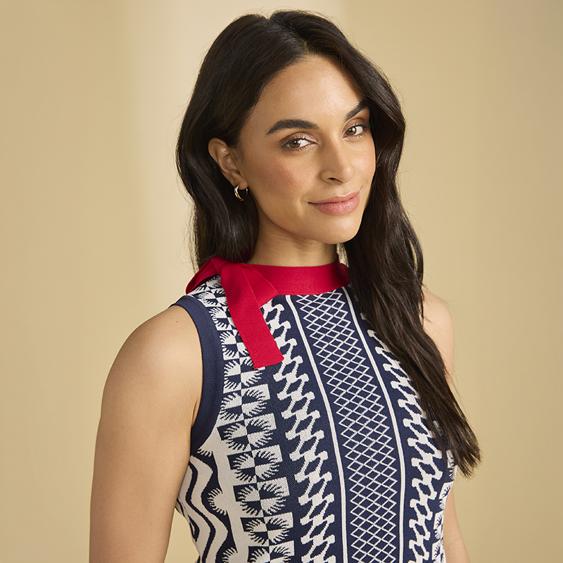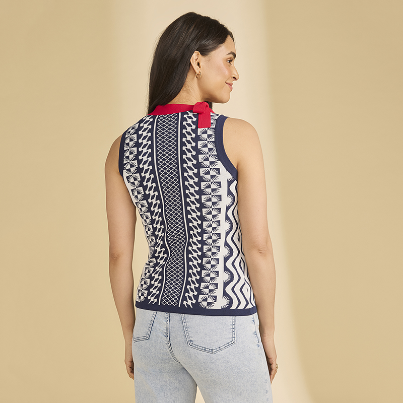 Modèle en tricot fin, près du corps, imprimé marine et blanc , col rouge.