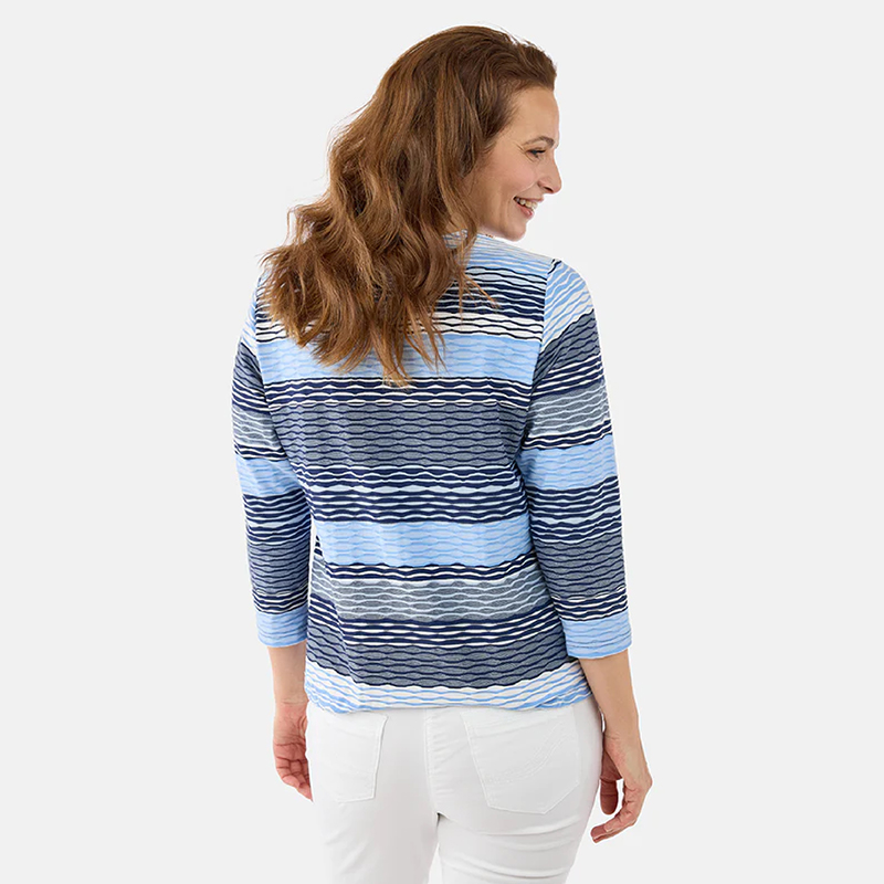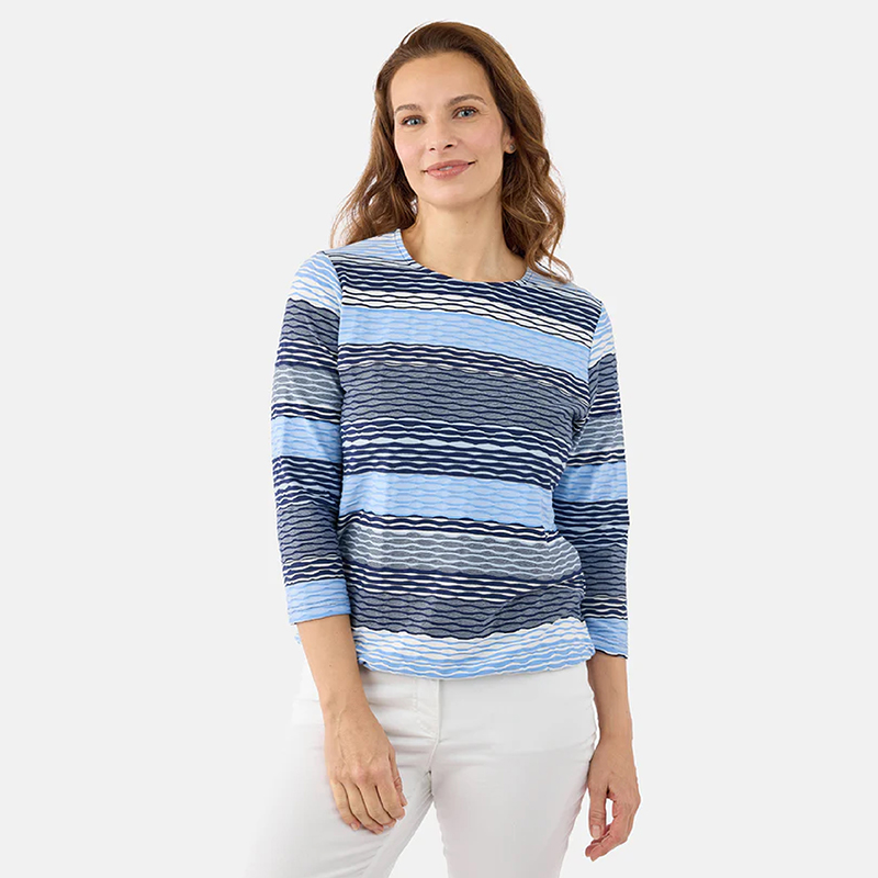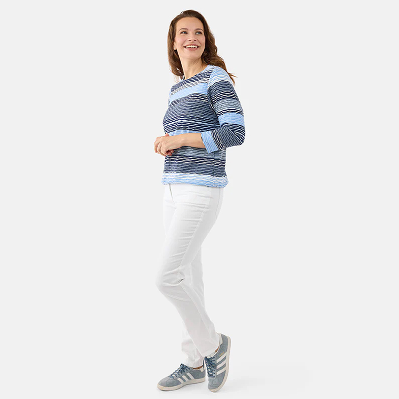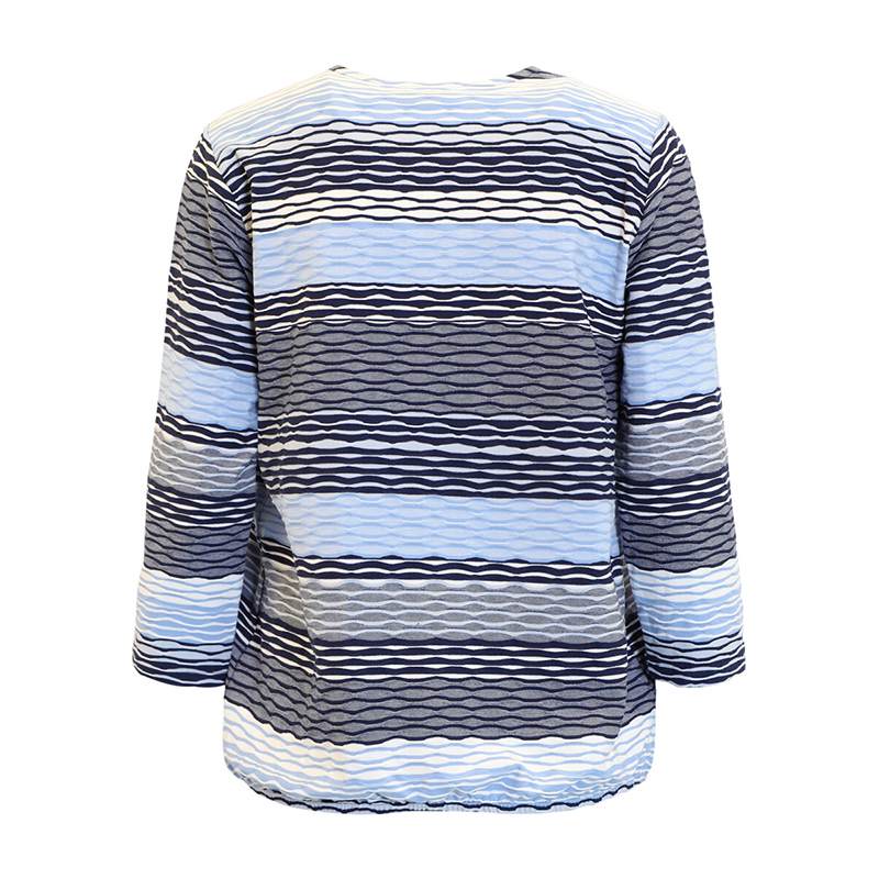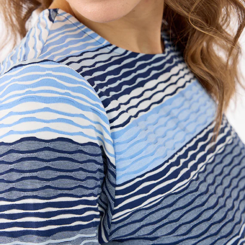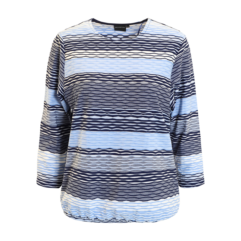 Modèle droit avec un élastique au bas pour donner un effet blousant, mélange de tons de bleus.
