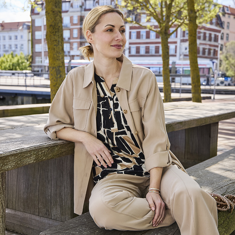 Modèle droit avec un plis creux sous la boutonnière pour donner de l’aisance au niveau du ventre.