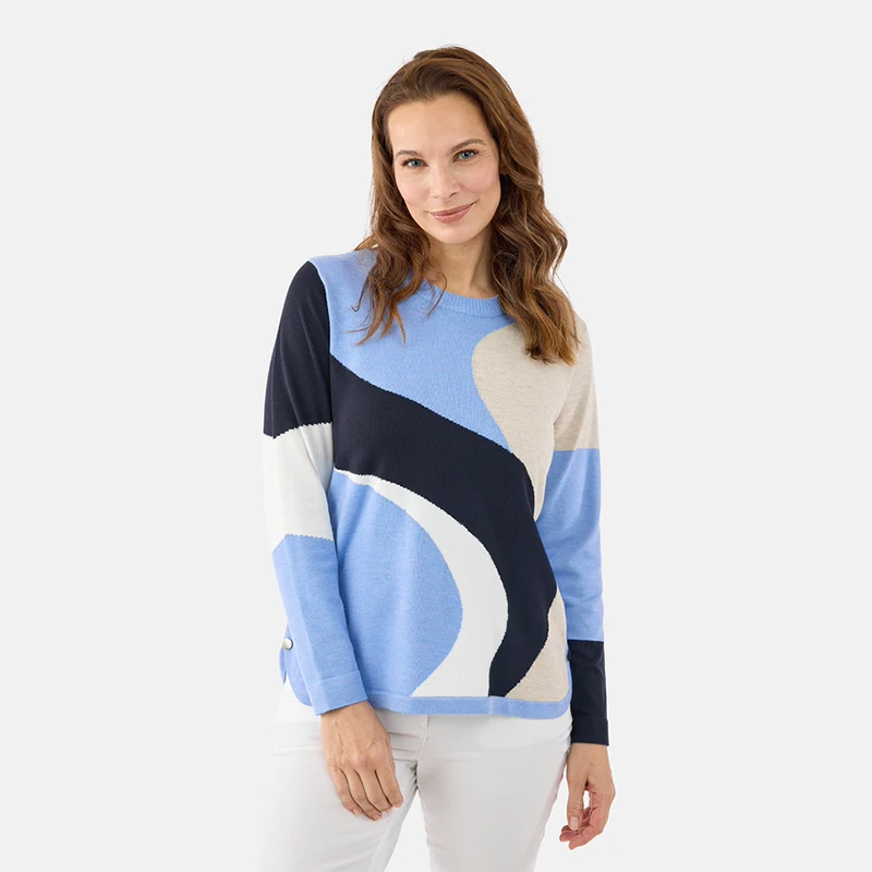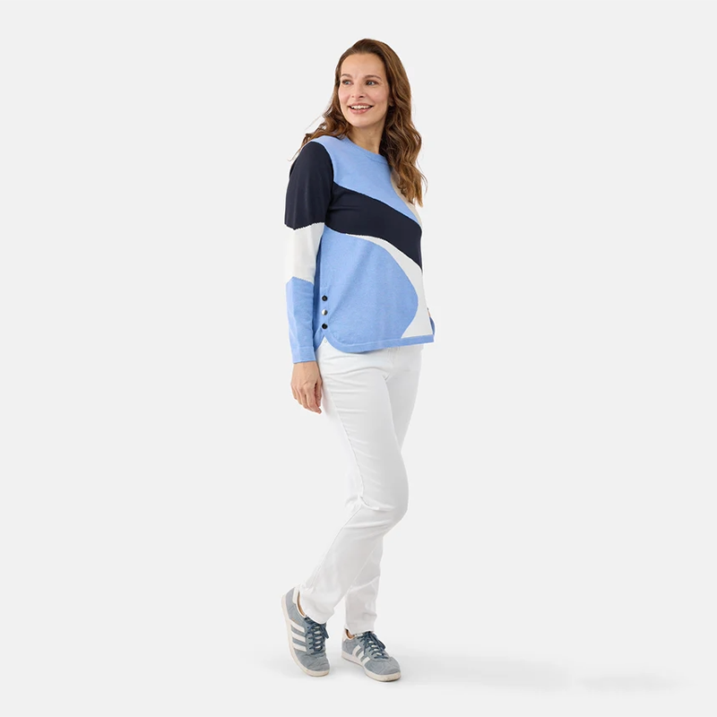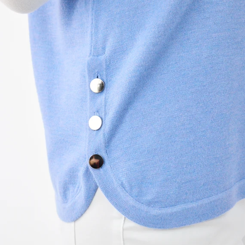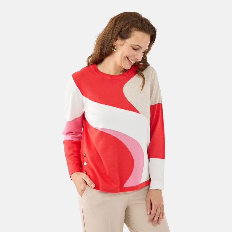 Modèle style tunique, arrondi au bas et jolis boutons argentés de chaque côté, deux thèmes de couleurs, rouge multicolore ou bleu pâle multicolore.