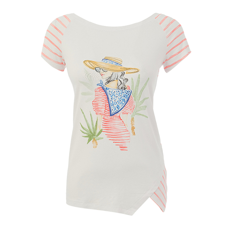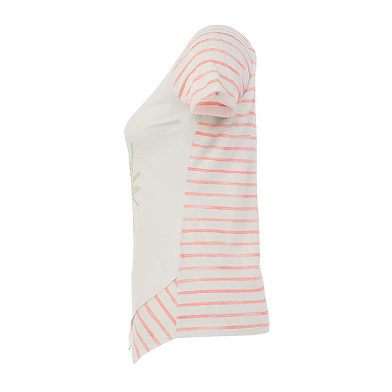 Modèle semi ajusté, manches et dos rayé blanc et corail.