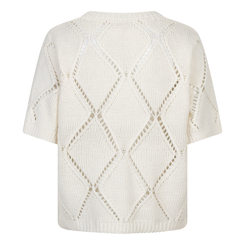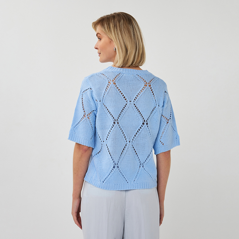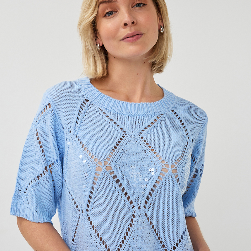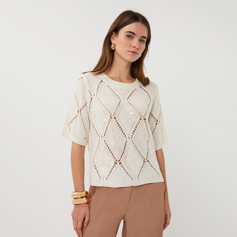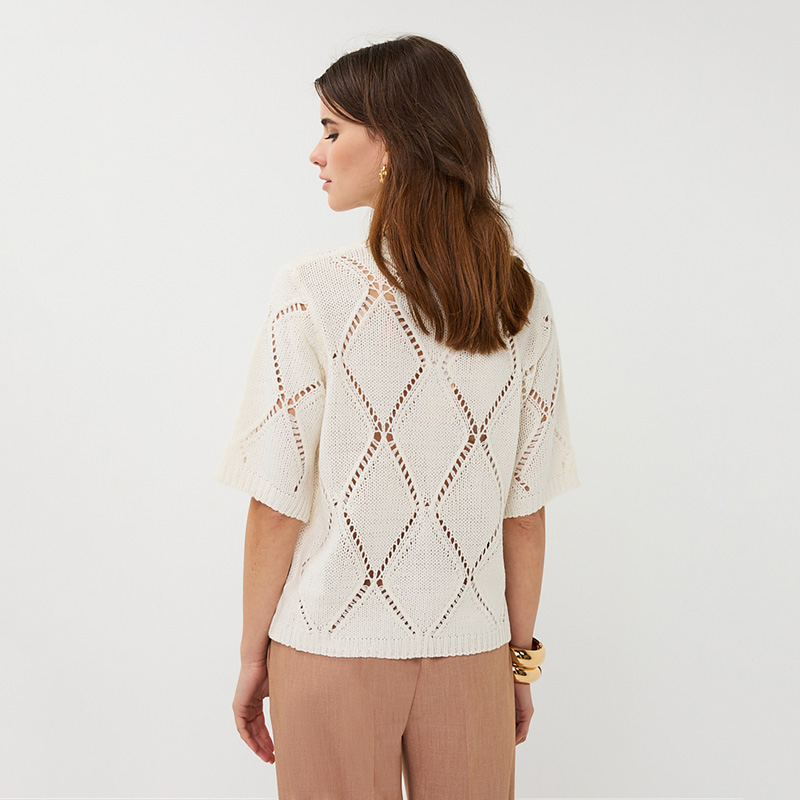 Chandail en tricot ajouré à manches courtes aux coudes, encolure ronde.