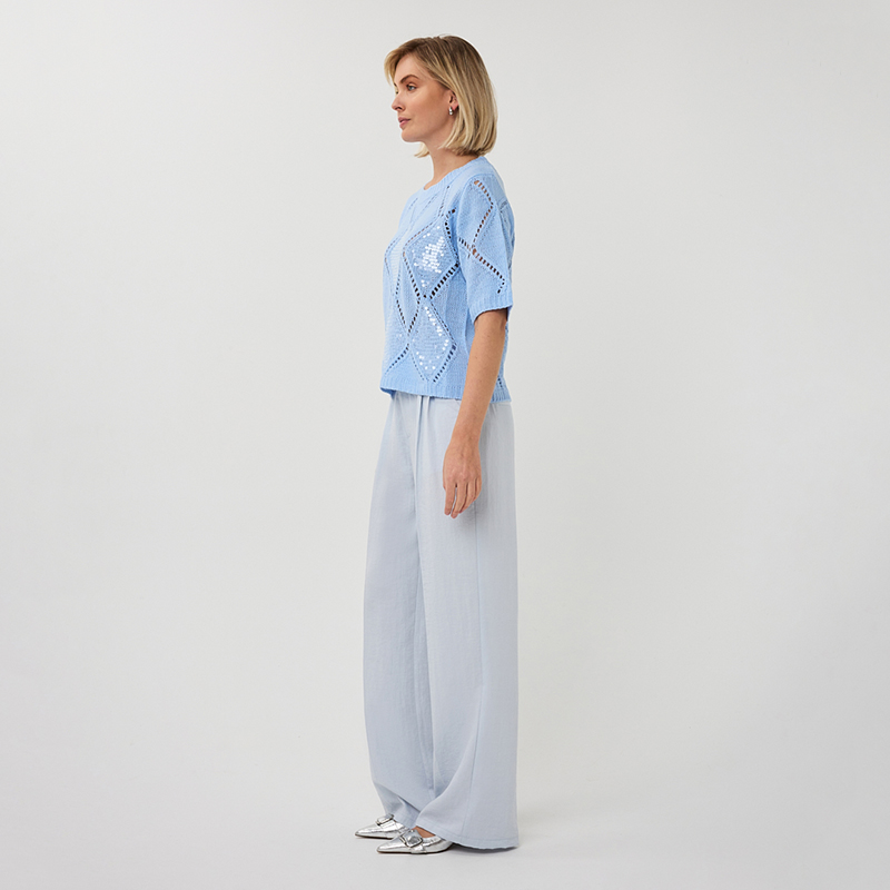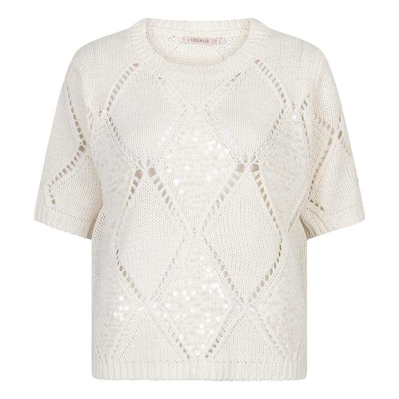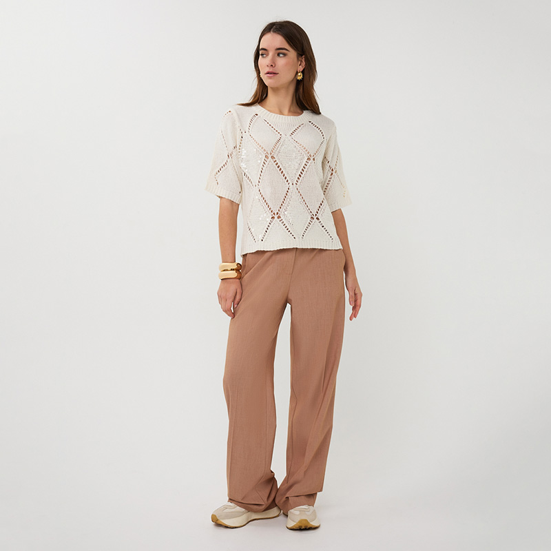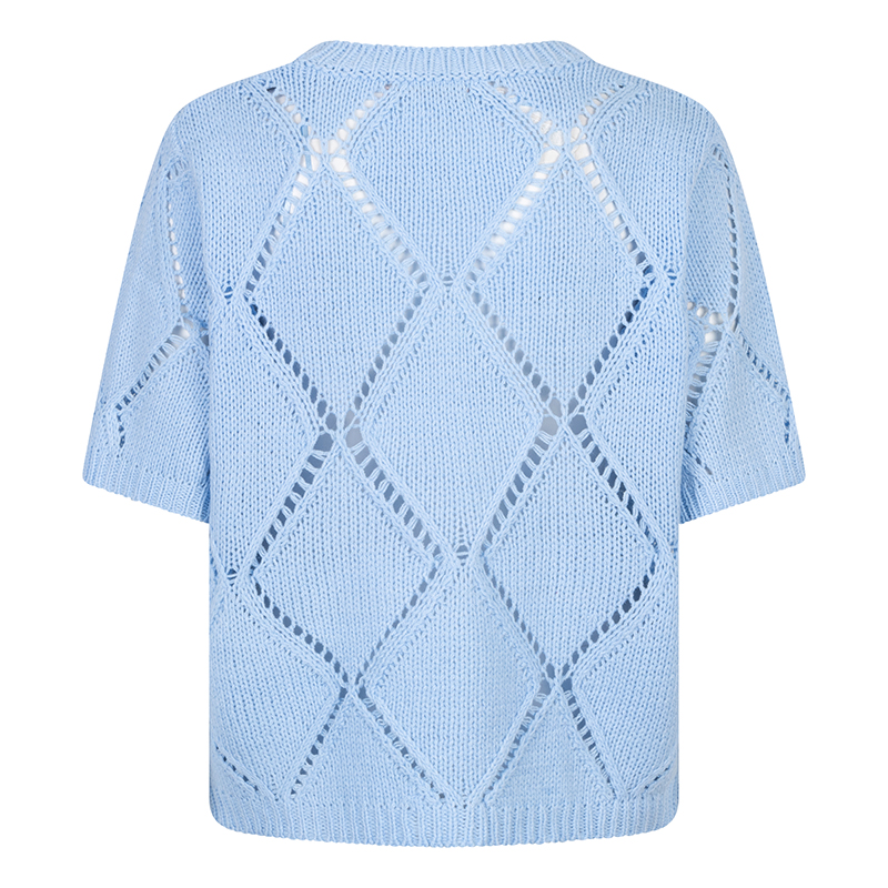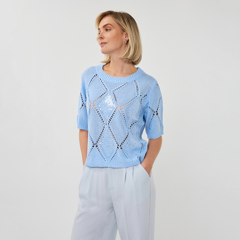 Chandail en tricot ajouré à manches courtes aux coudes, encolure ronde.