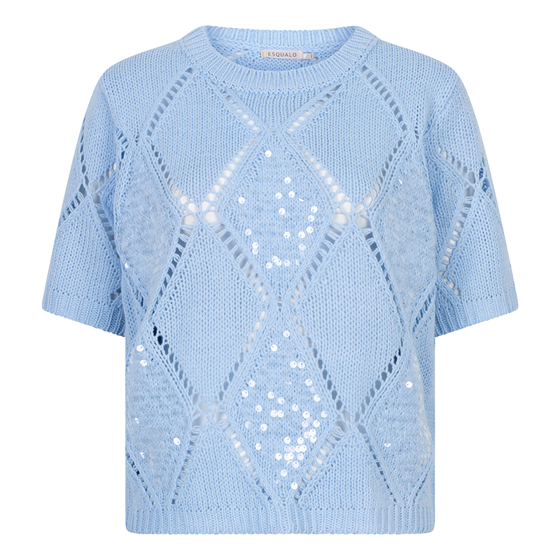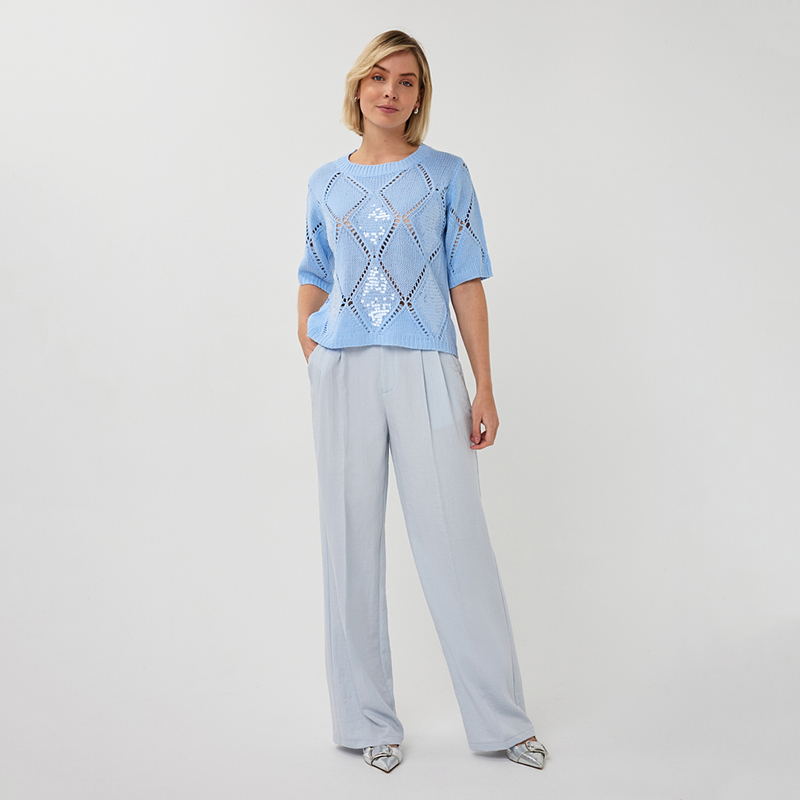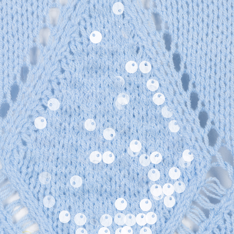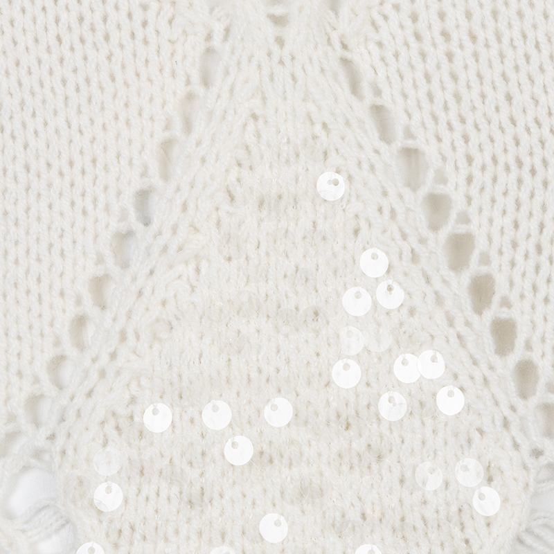 Modèle court et droit, motifs de losanges dans le tricot avec paillettes transparentes,  disponible ivoire ou bleu.