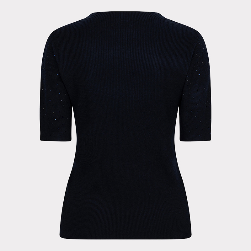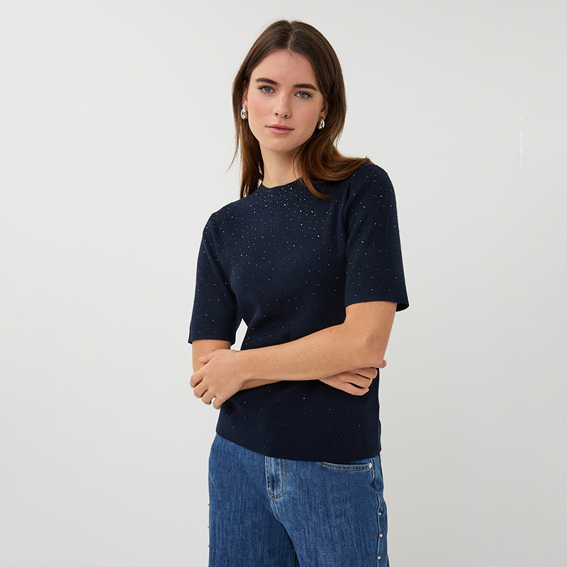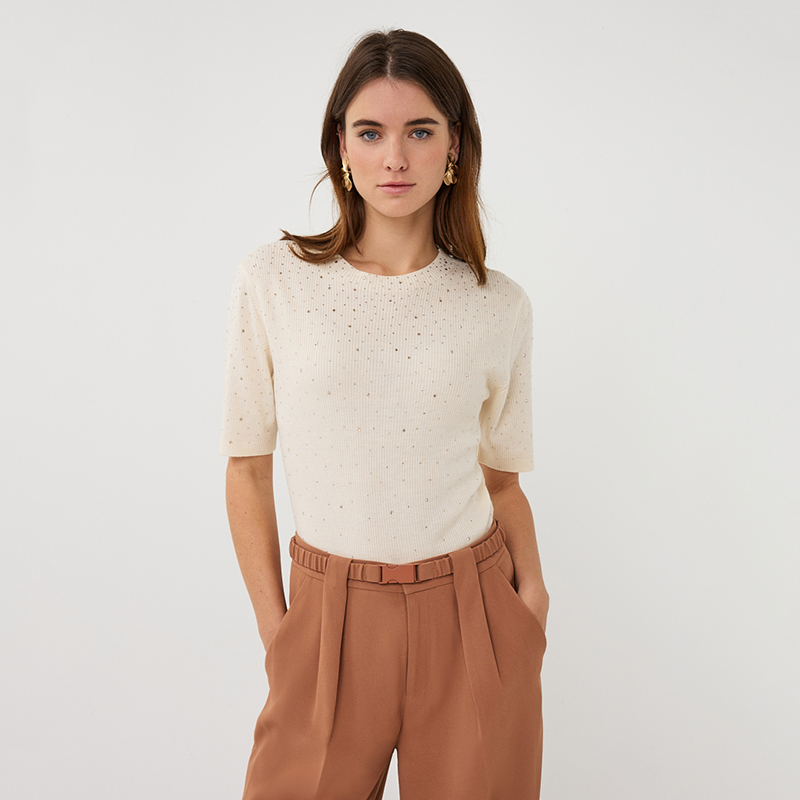 Modèle ajusté avec un petit rib,  pierres au devant seulement pour un p’tit look sport-chic et stylisé.