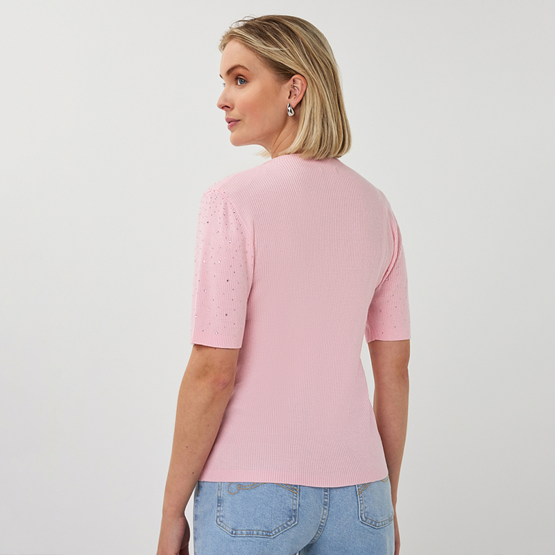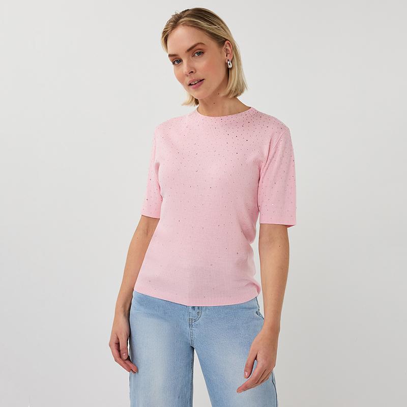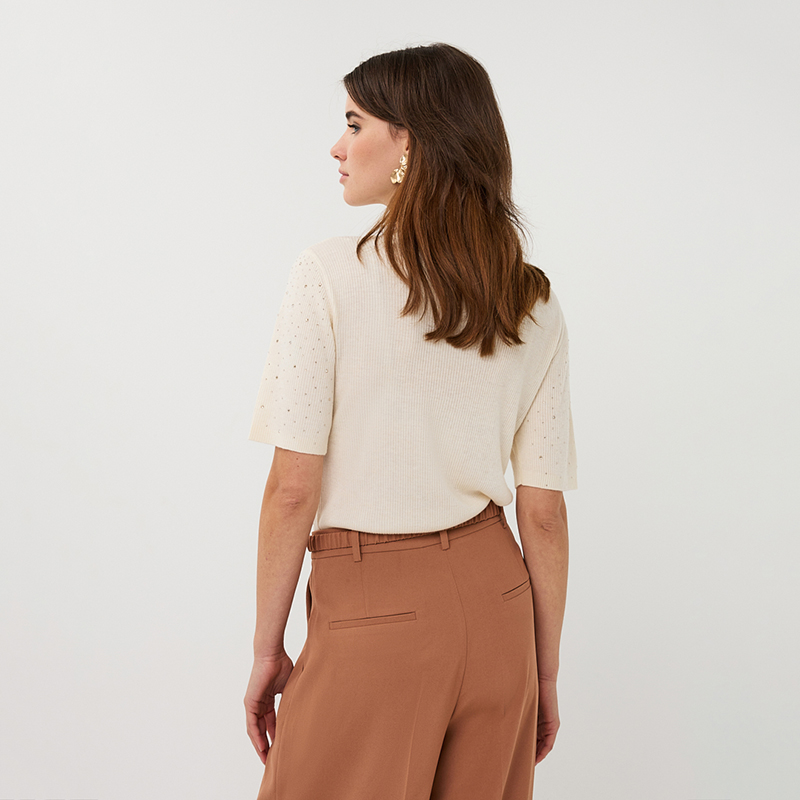 Chandail en tricot fin à manches courtes aux coudes, encolure ronde près du cou.