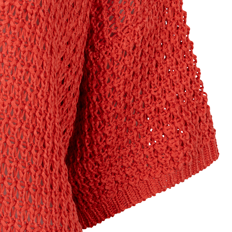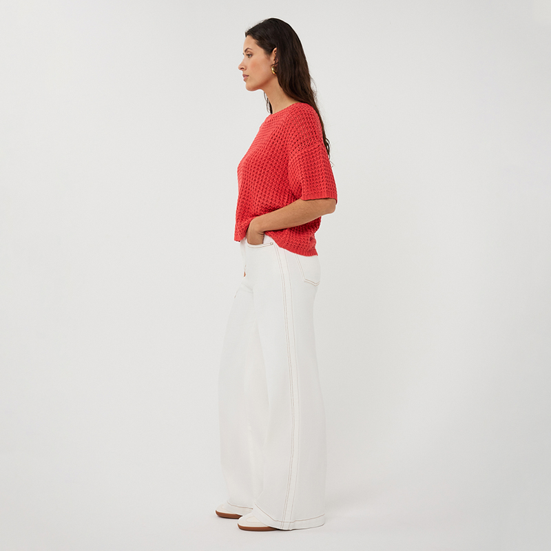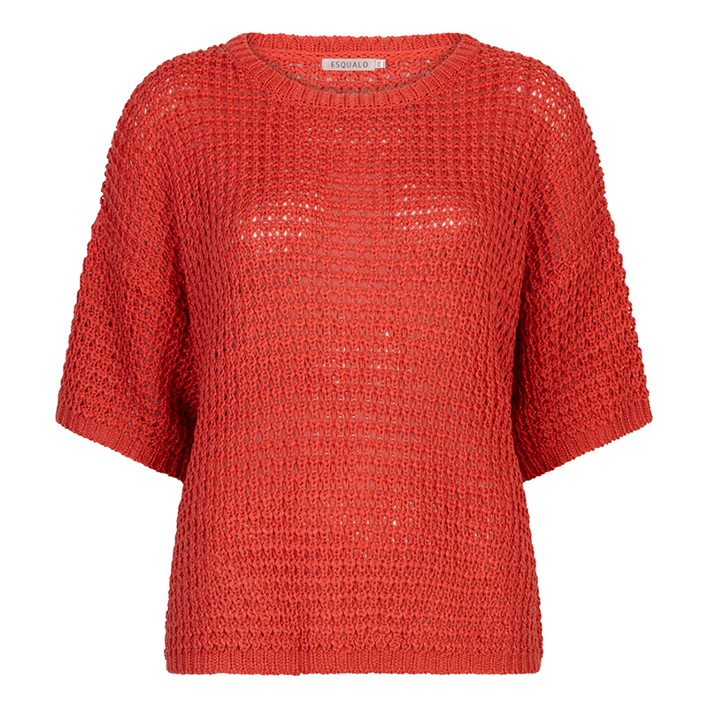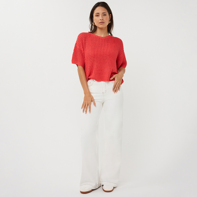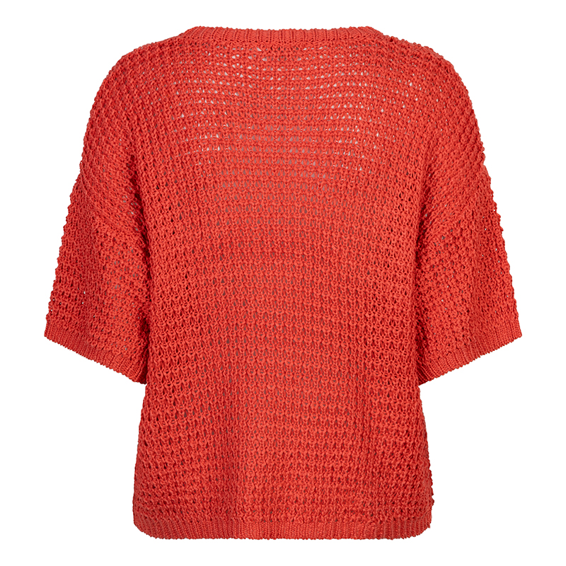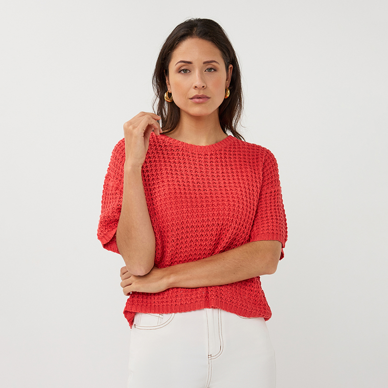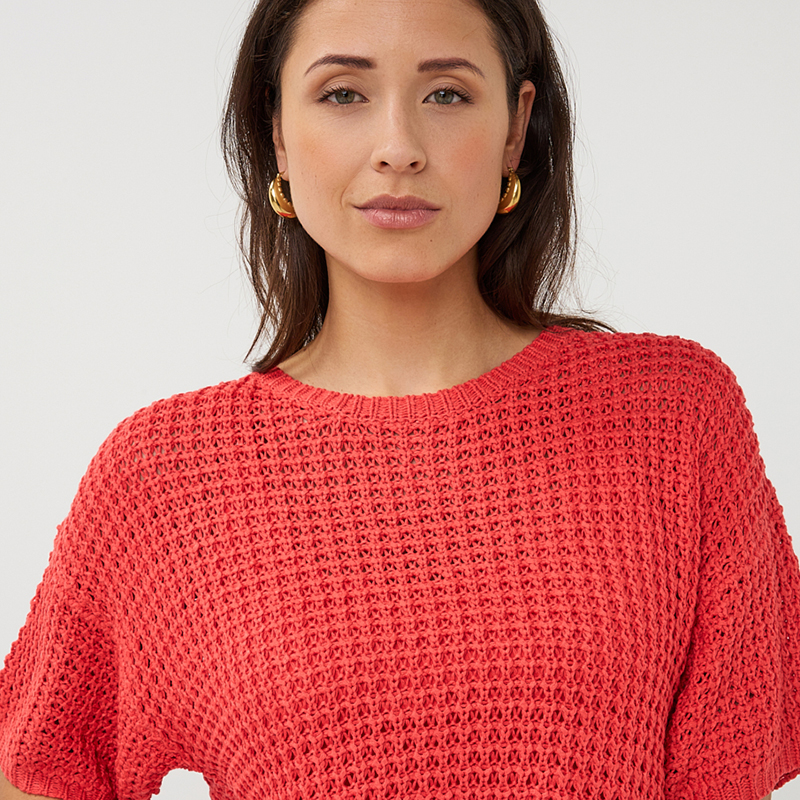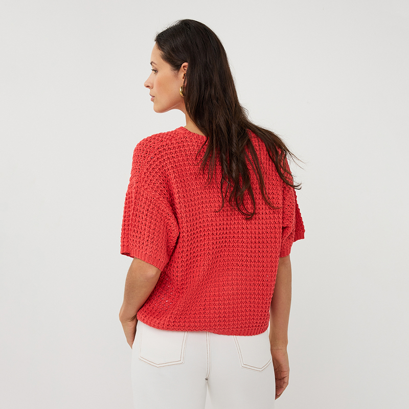 Chandail en mailles ajourées à manches courtes non structurées, épaules basses, encolure ronde près du cou.