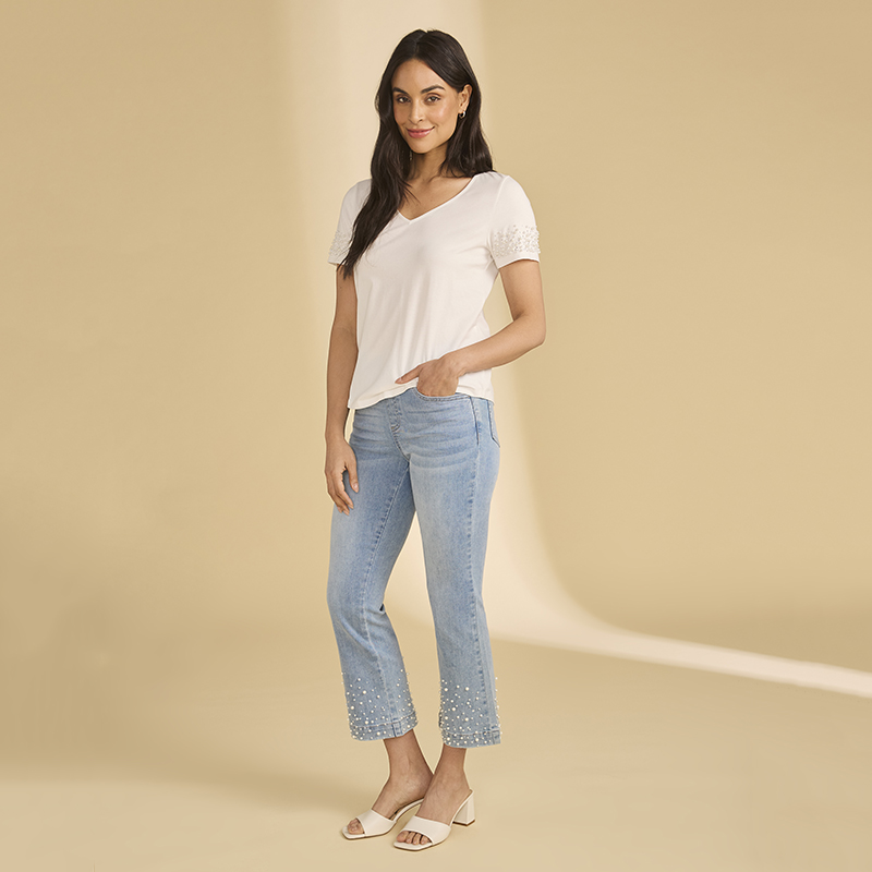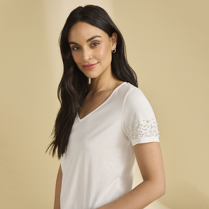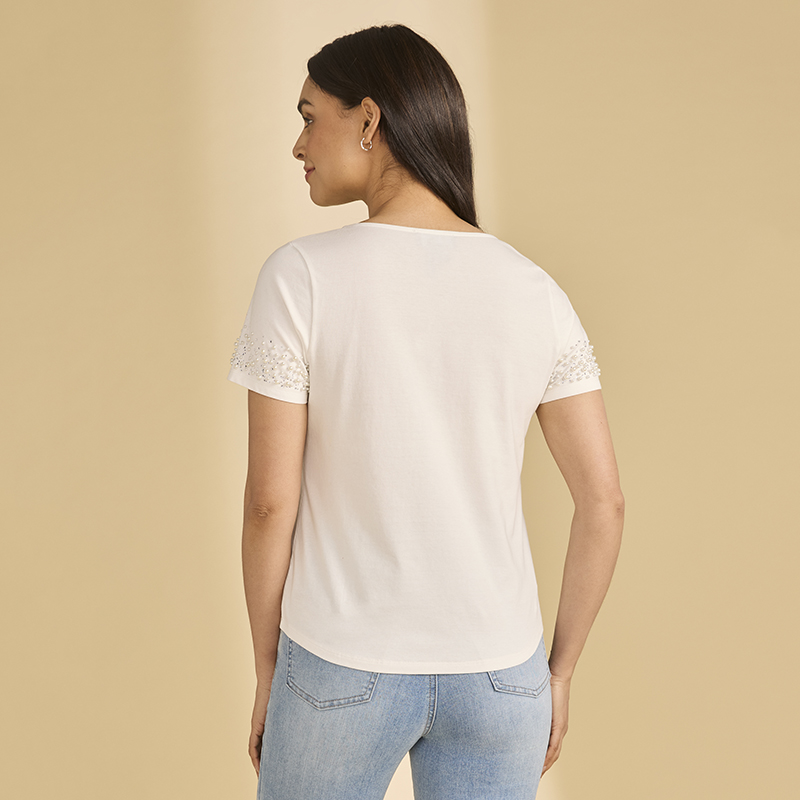 Modèle droit arrondi au bas, de jolies perles sur les manches lui donne un donne un style féminin et original, disponible blanc.