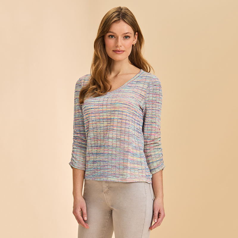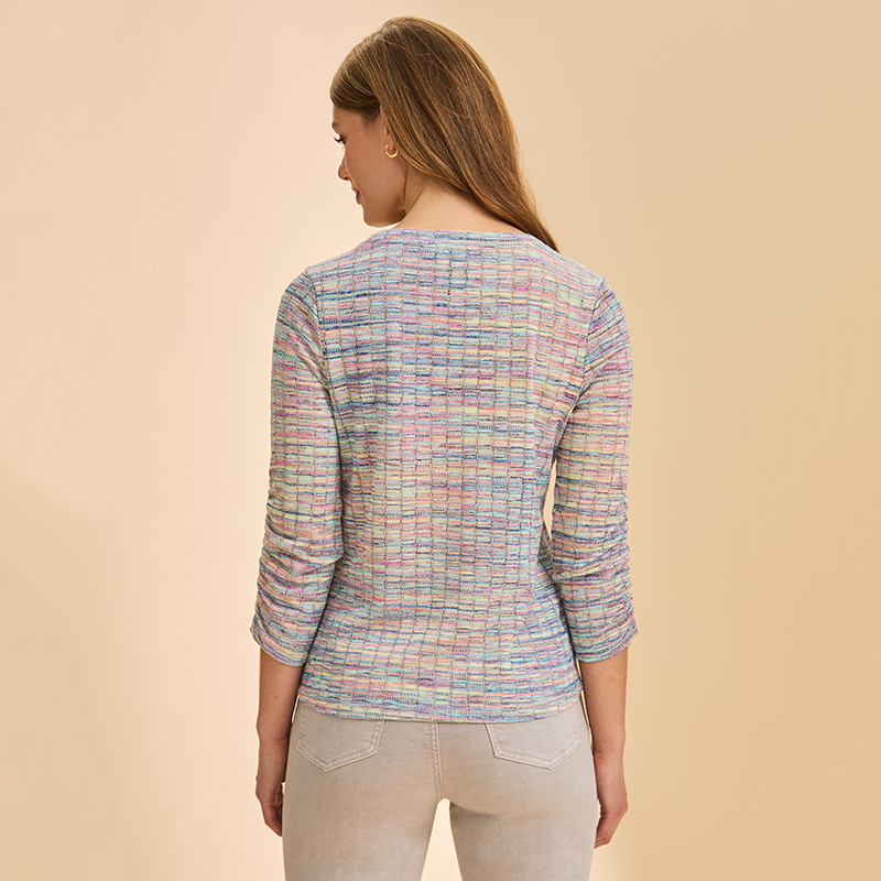 Chandail en tricot léger et ajouré à manches 3/4 plissées sur le dessus, encolure en pointe.