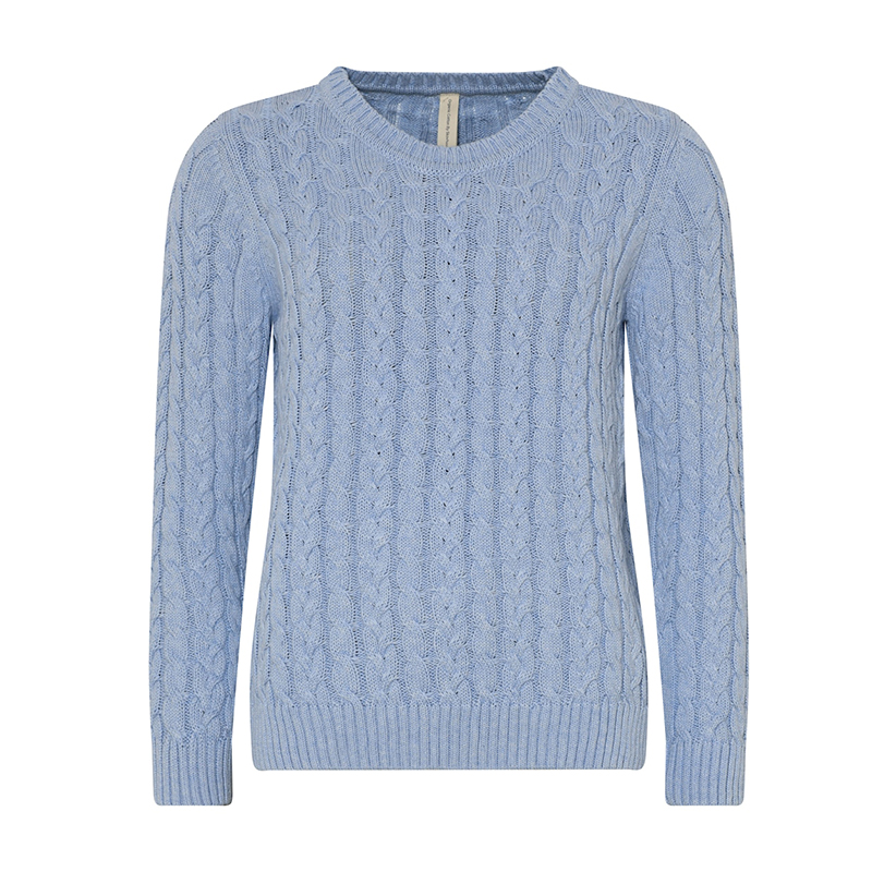 Modèle droit cossé au bas, beau motifs de câbles classique, disponible bleu pâle.