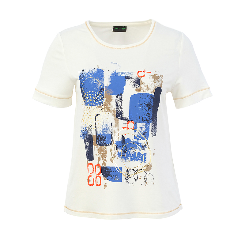 Modèle droit ivoire, belle finition aux manches, à l’encolure et au bas, de surpiqûres dorées, motifs abstraits.