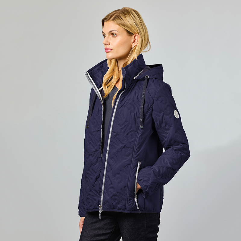 Modèle court et droit, motifs signature dans le tissu matelassé embossé « JNG » original, bande extensible de chaque côté.