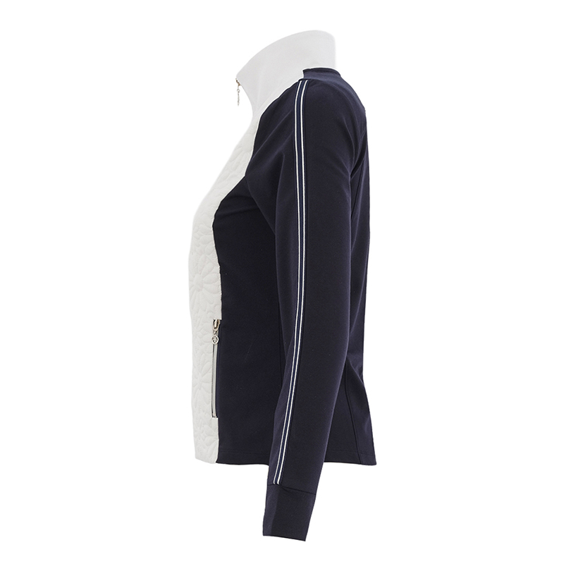 Modèle semi-ajusté blanc et marine, dos et manches en coton marine, le devant du jacket est blanc matelassé à motif de marguerite.