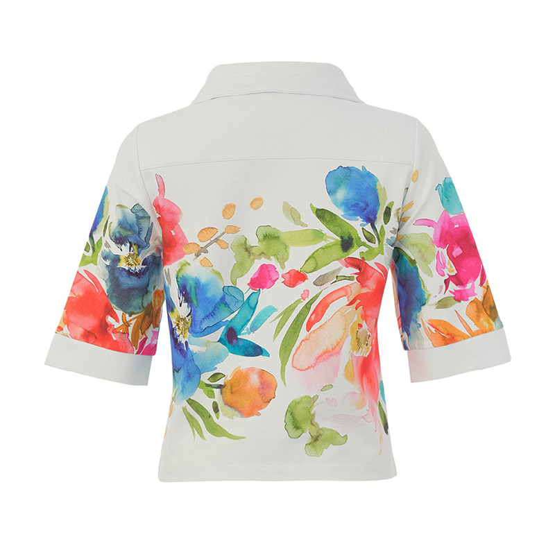 Modèle court et droit, bel imprimé blanc multicolore fait à partir d’une toile de l’artiste peintre « Basak Erarslan ».