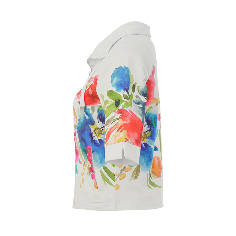 Jacket en tricot extensible à manches courtes aux coudes, col montant avec un fermoir.