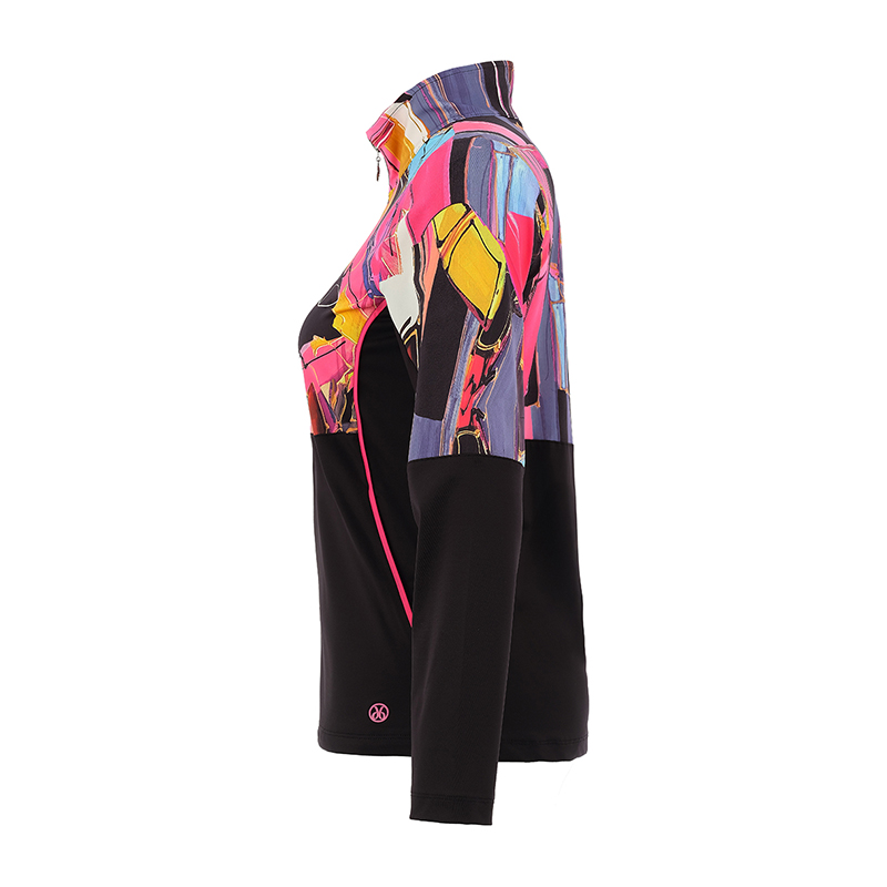 Modèle semi ajusté, poches en biais avec fermoir de chaque côté, noir et imprimé à partir d’une toile de l’artiste peintre « Lana Frey ».