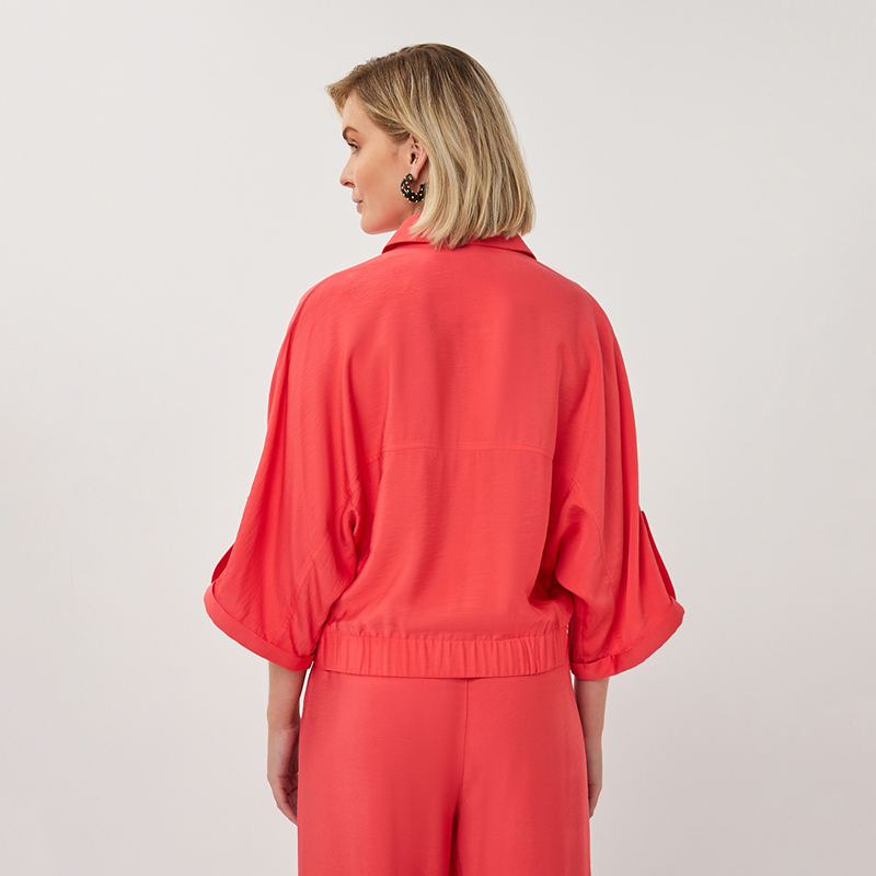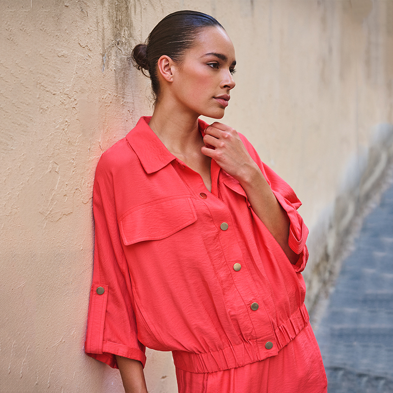 Modèle court et ample, élastique au bas pour un effet blousant, poches en biais.