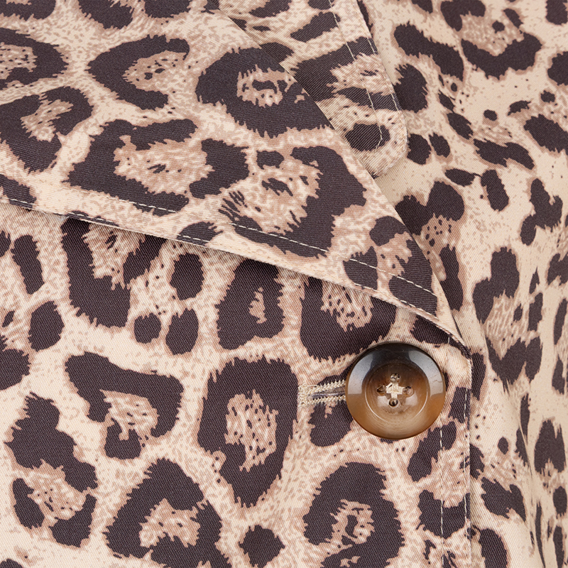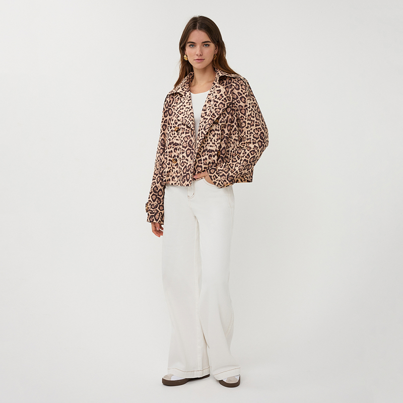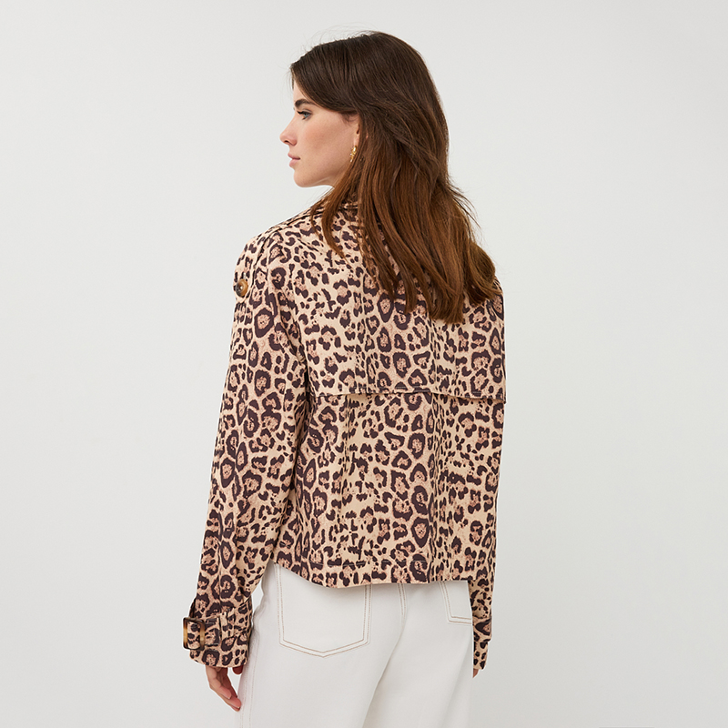 Modèle court et ample « oversize » style imper, doublé breast, très stylé à motifs animal, entièrement doublé.