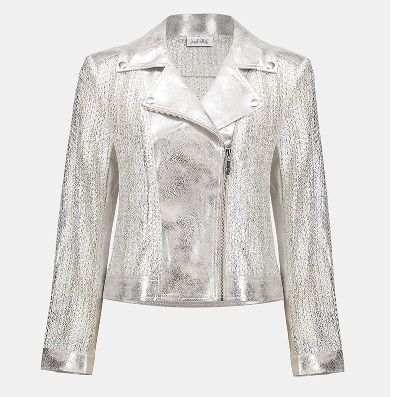 Modèle court style perfecto, mélange de simili cuir et de tricot ajouré, très léger.