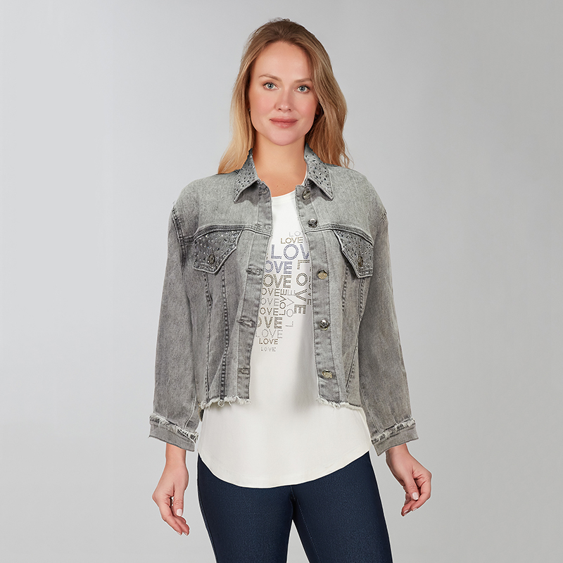 Jacket en denim souple à manches 3/4, col classique avec des pierres argentées.