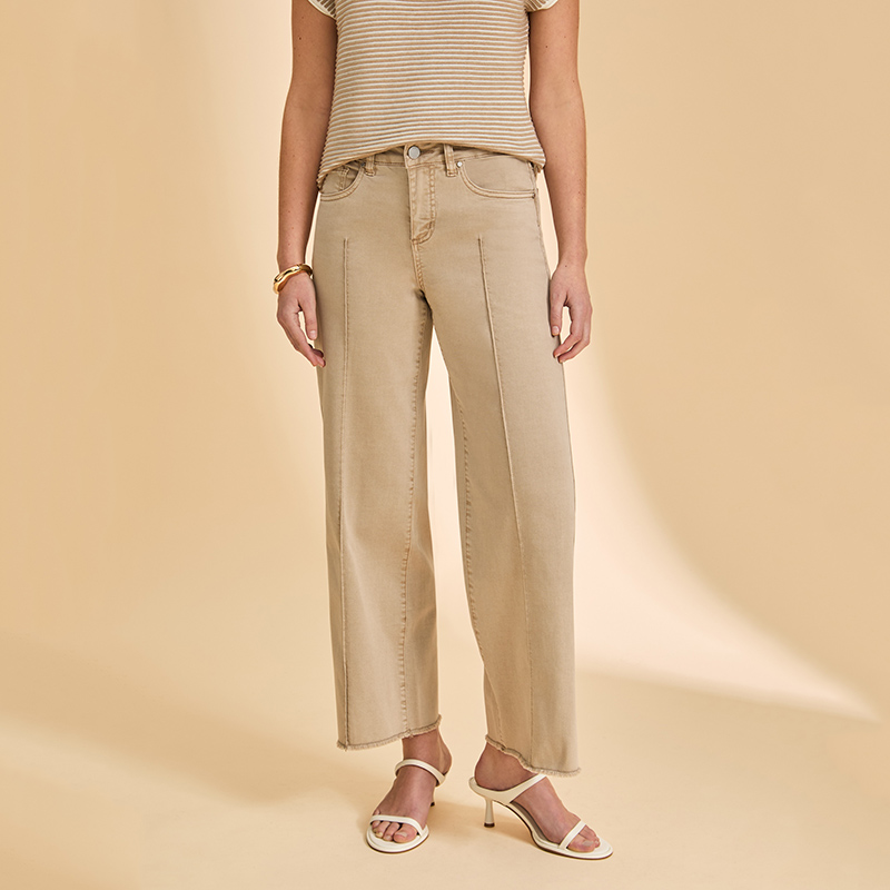 Modèle jambes larges franges au bas, surpiqûre ton sur ton sur le devant et l’arrière des jambes.