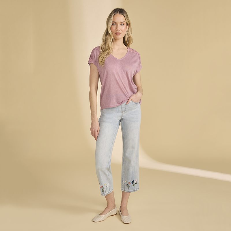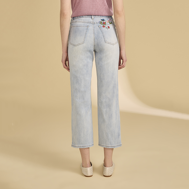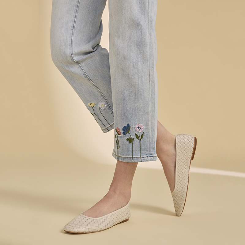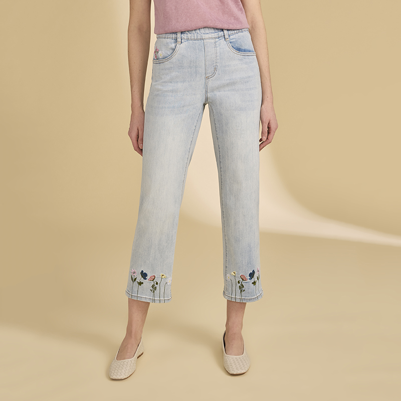 Modèle jambes droites broderies de petites fleurs multicolores au bas et sur une poche arrière, denim pâle.