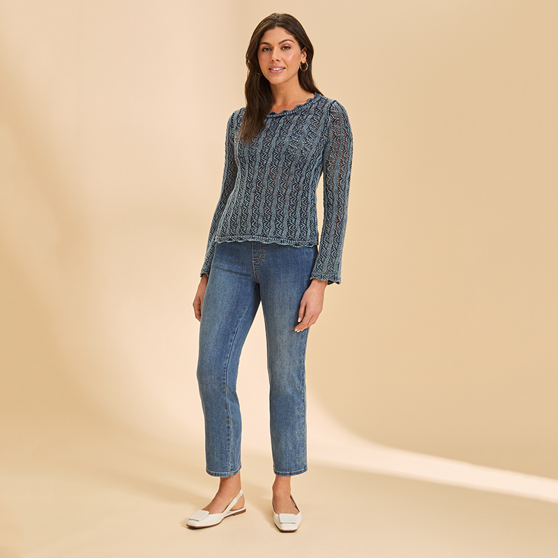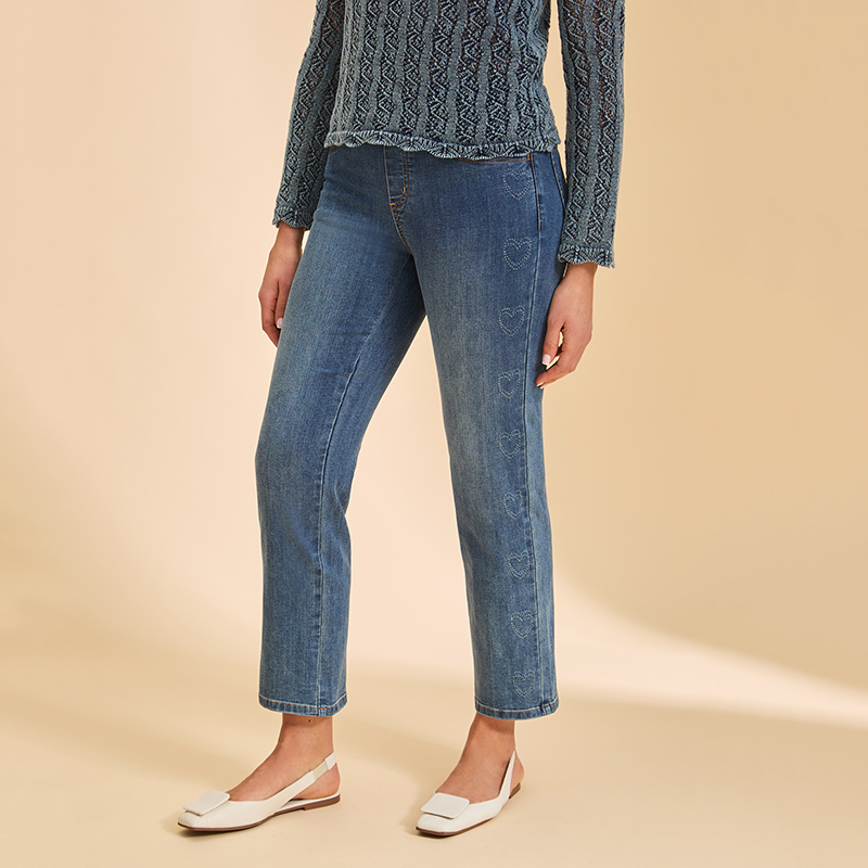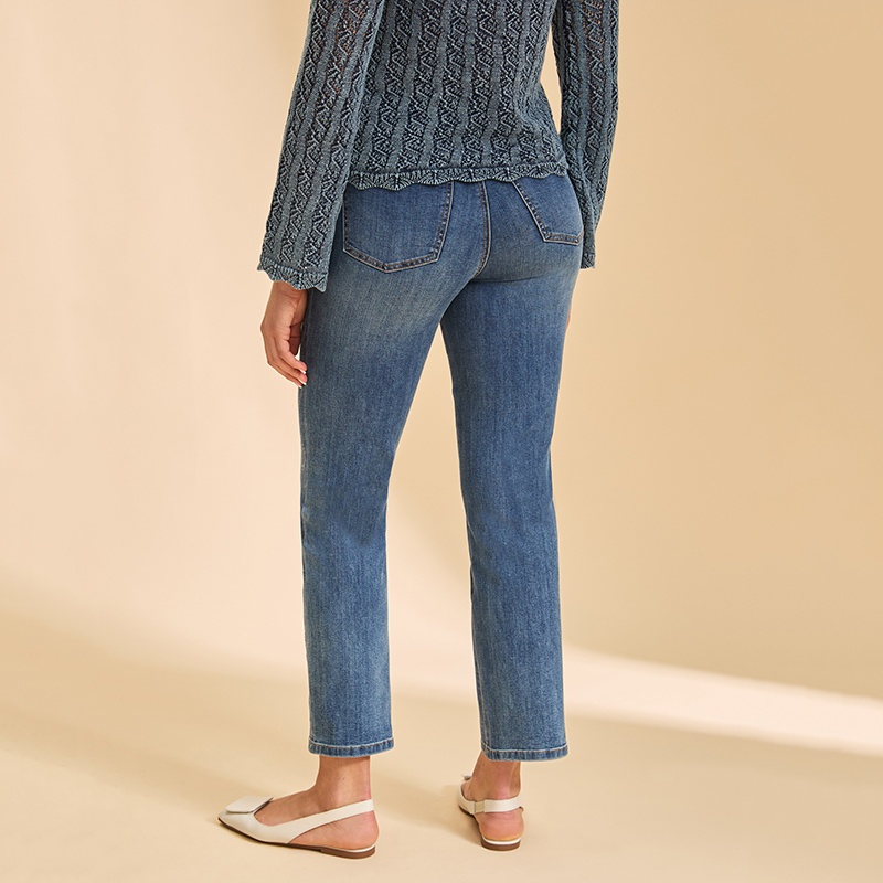 Jeans bande de taille élastique confortable, longueur 7/8, jambes droites.