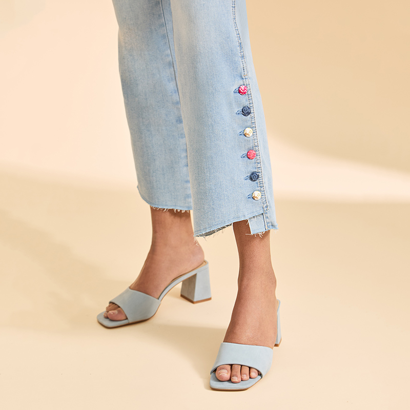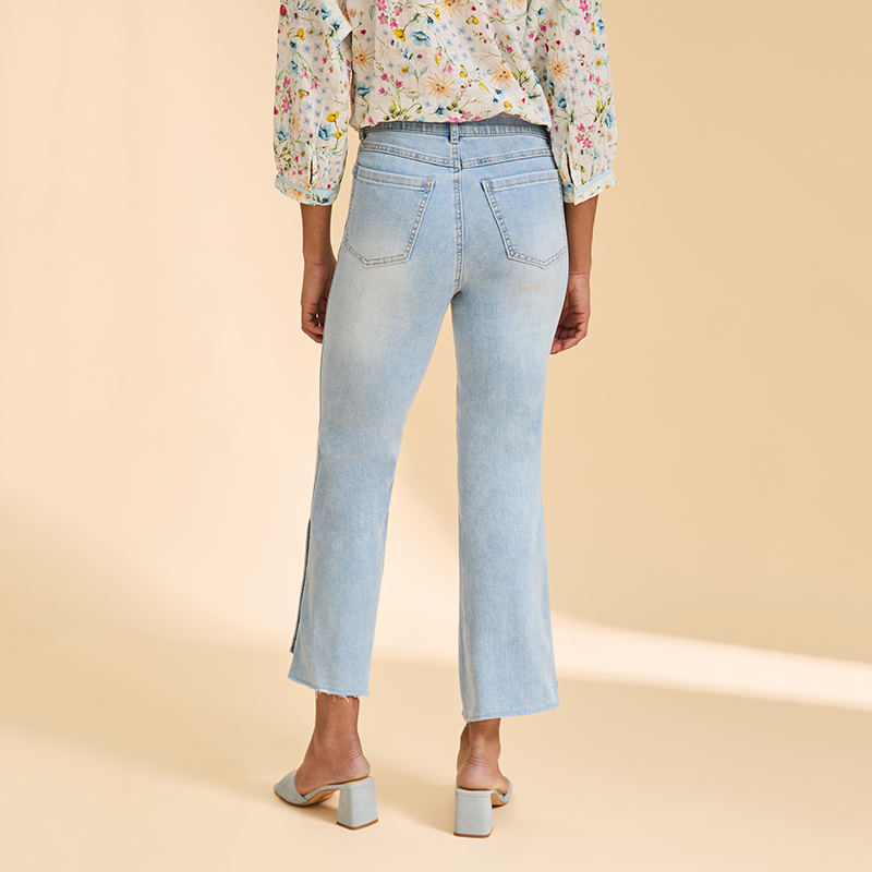 Jeans bande de taille élastique confortable, longueur 7/8, jambes droites.