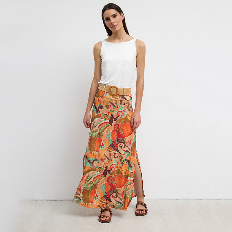 Modèle légèrement évasé ouvert de chaque côté jusqu’au genou, imprimé coloré aux tons de orangé.