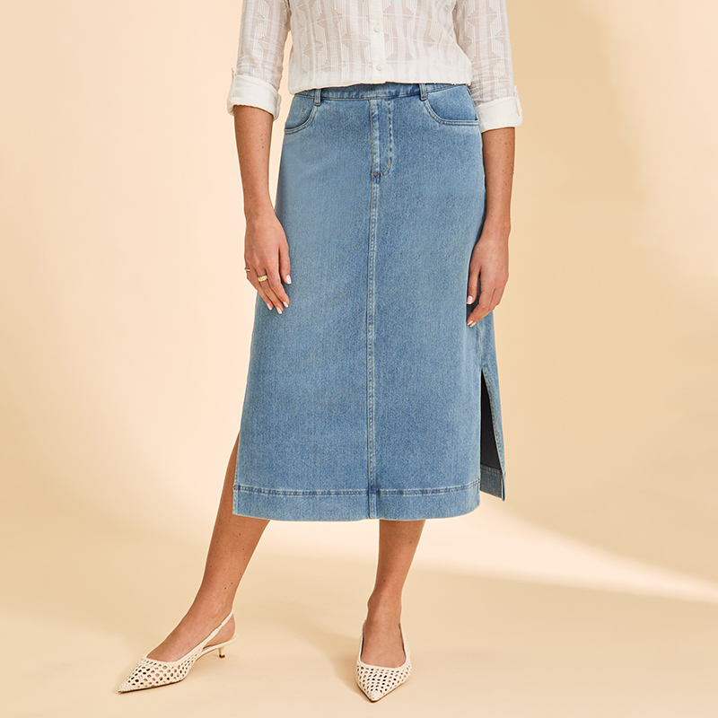 Jupe longue et droite ouverture de chaque côté, bande de taille élastique.