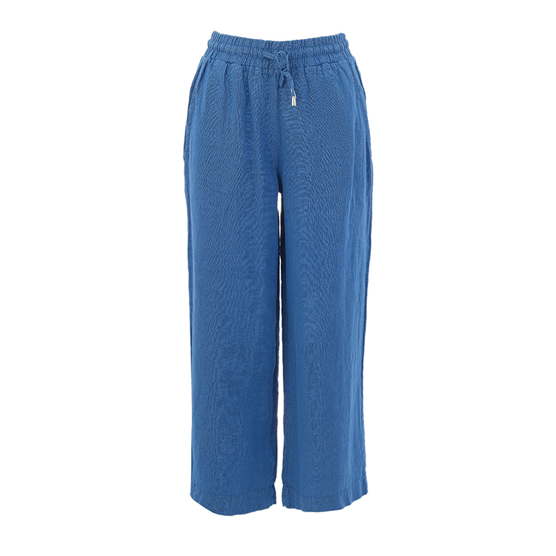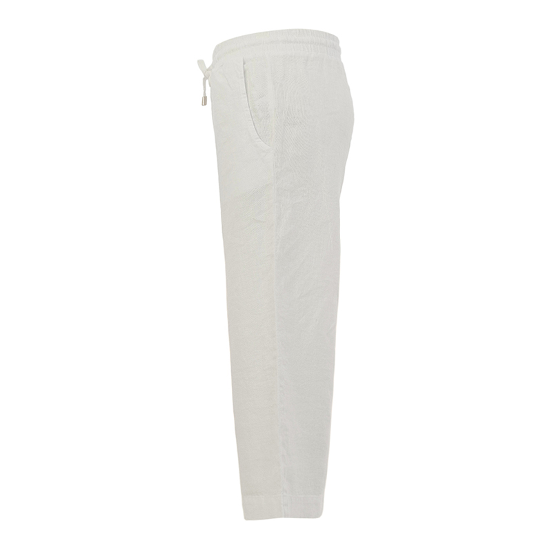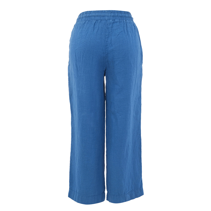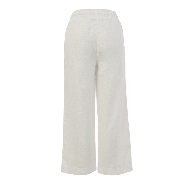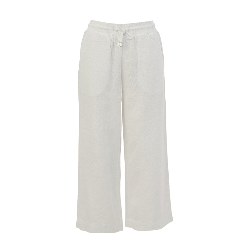 Pantalon en lin 7/8, taille élastique avec cordon, poches en biais, coupe relax et confortable.