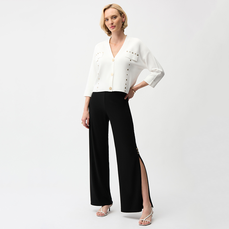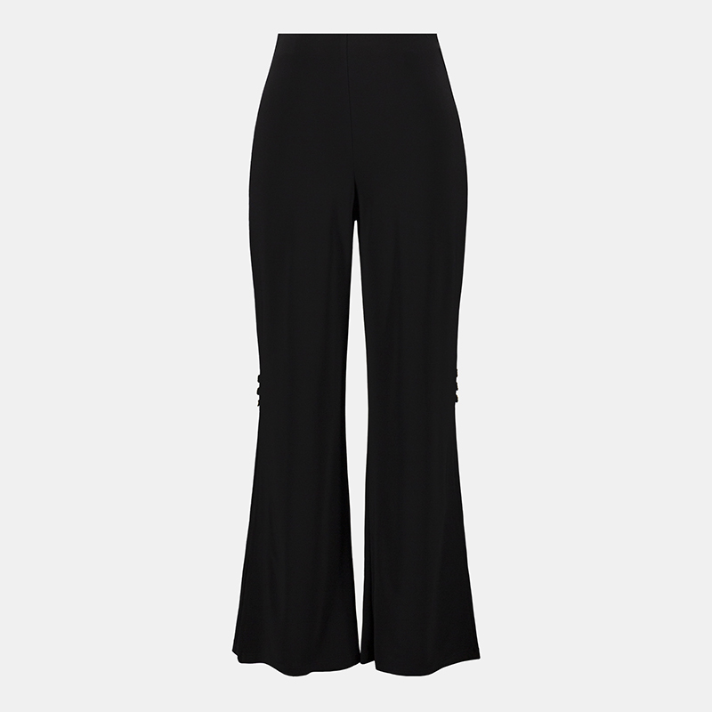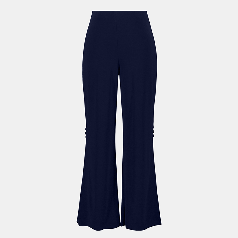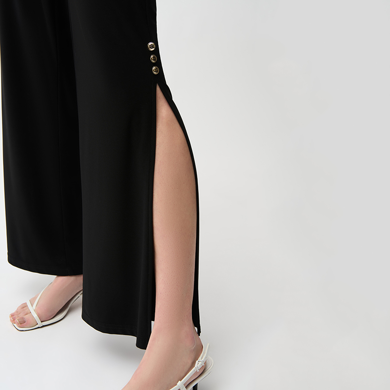 Modèle jambes droites ouvert jusqu’au genou sur le côté extérieur avec trois petits boutons dorés décoratifs.