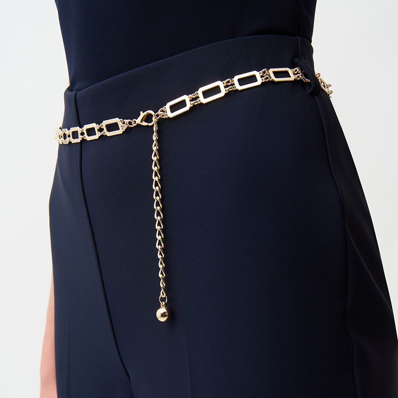 Pantalon bande de taille élastique confortable, petite ceinture en chaîne dorée incluse.
