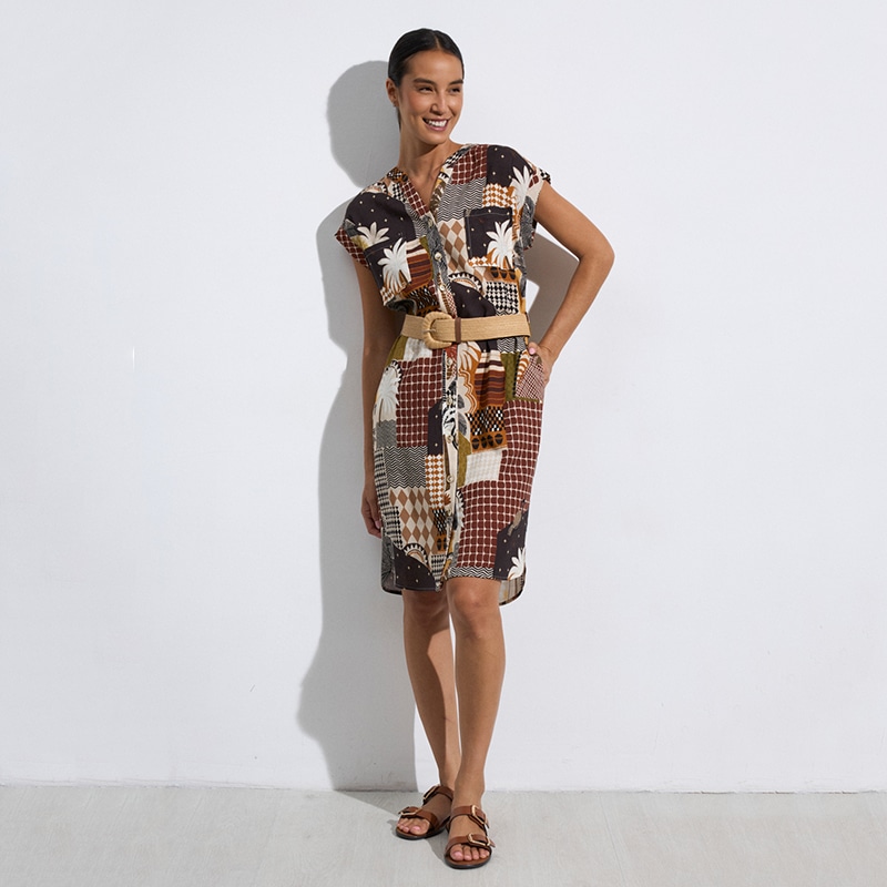 Modèle droit, ceinturé à la taille, boutonné sur toute la longueur, poches plaquées au buste, bel imprimé kaki, brun et naturel.