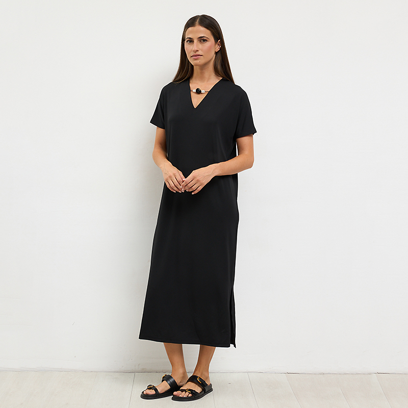 Robe longue en jersey léger à manches cap sans coutures aux épaules, encolure en pointe.